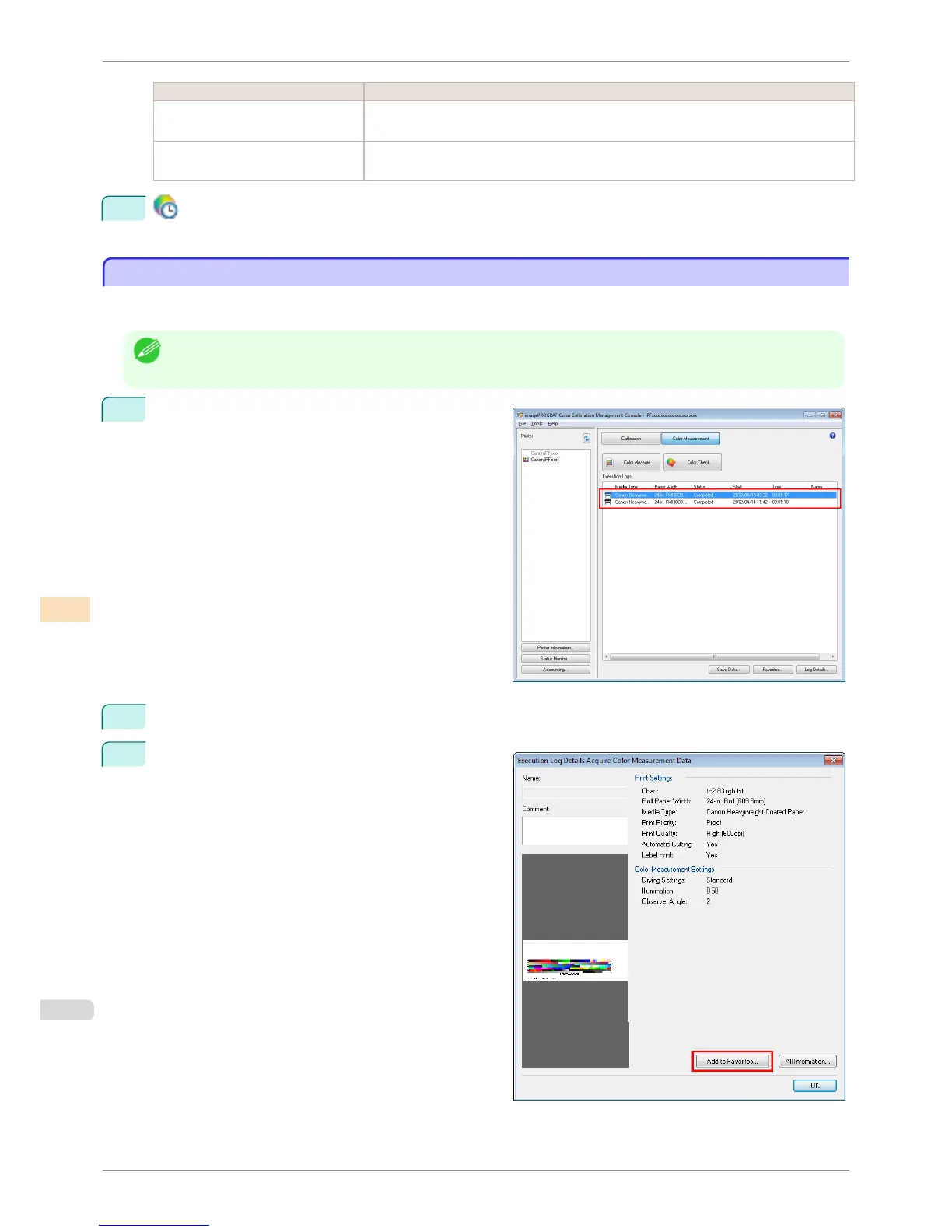You can register frequently used execution logs in favorites for Acquire Color Measurement Data. Registering an