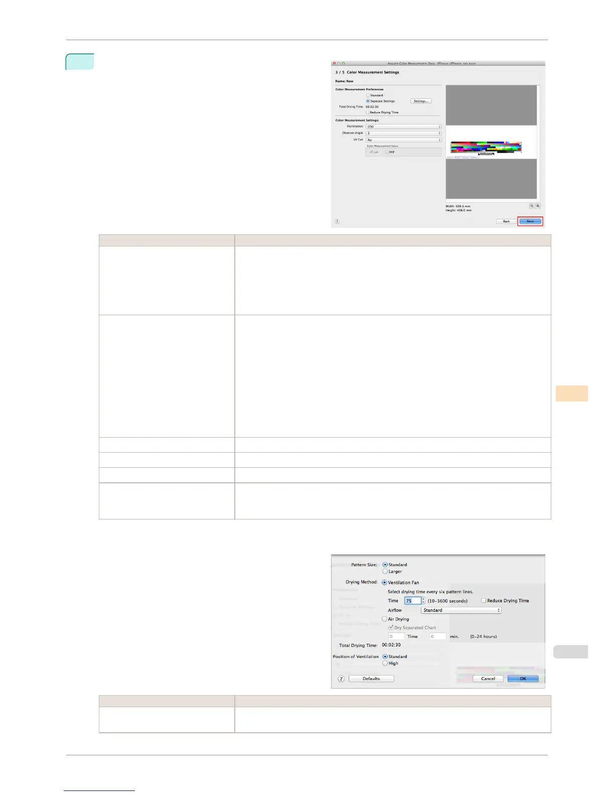 *1: If you want to enlarge the color chart pattern or configure the color chart drying settings in detail, click the Settings button to