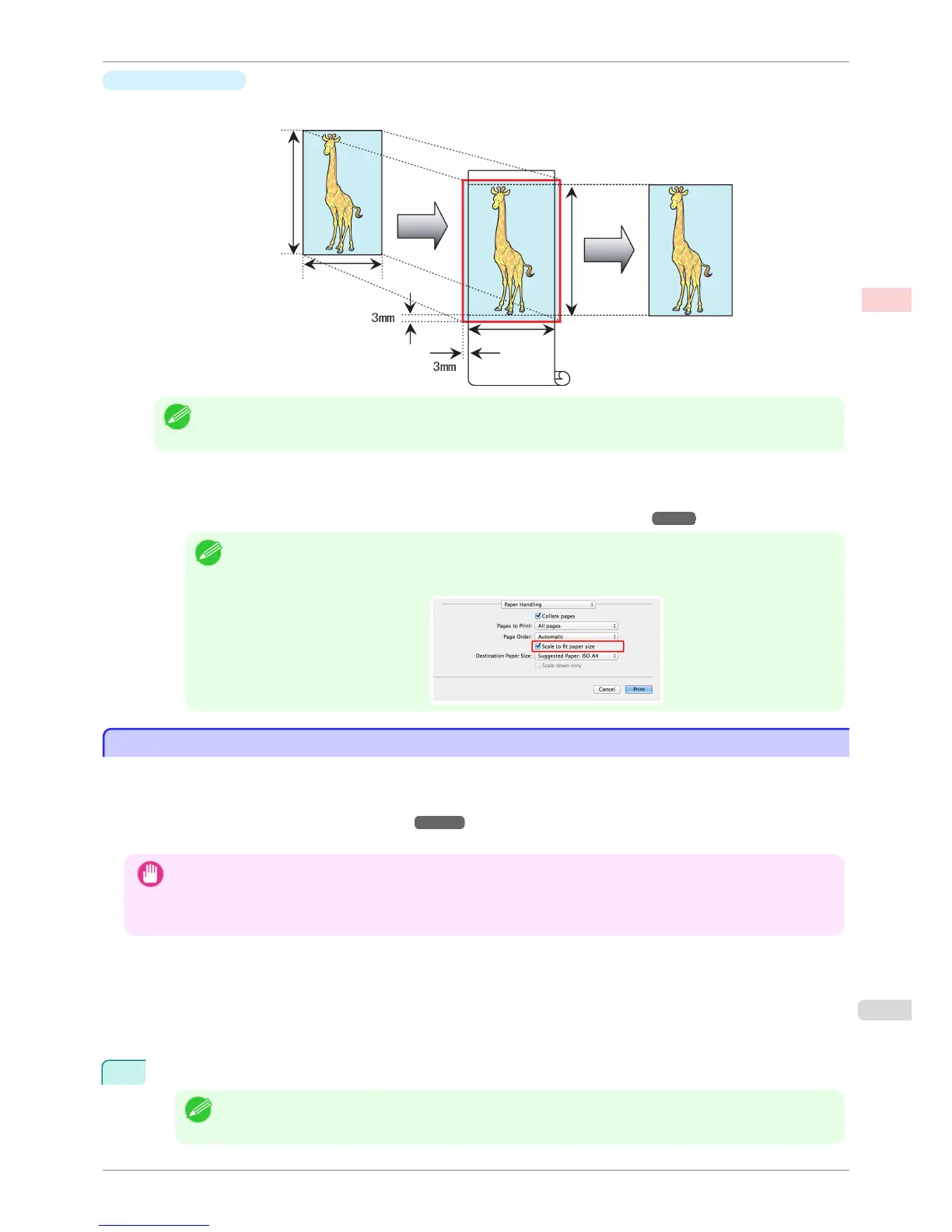 • To perform borderless printing with resizing to fit the paper size on Mac OS, select borderless in Paper Size