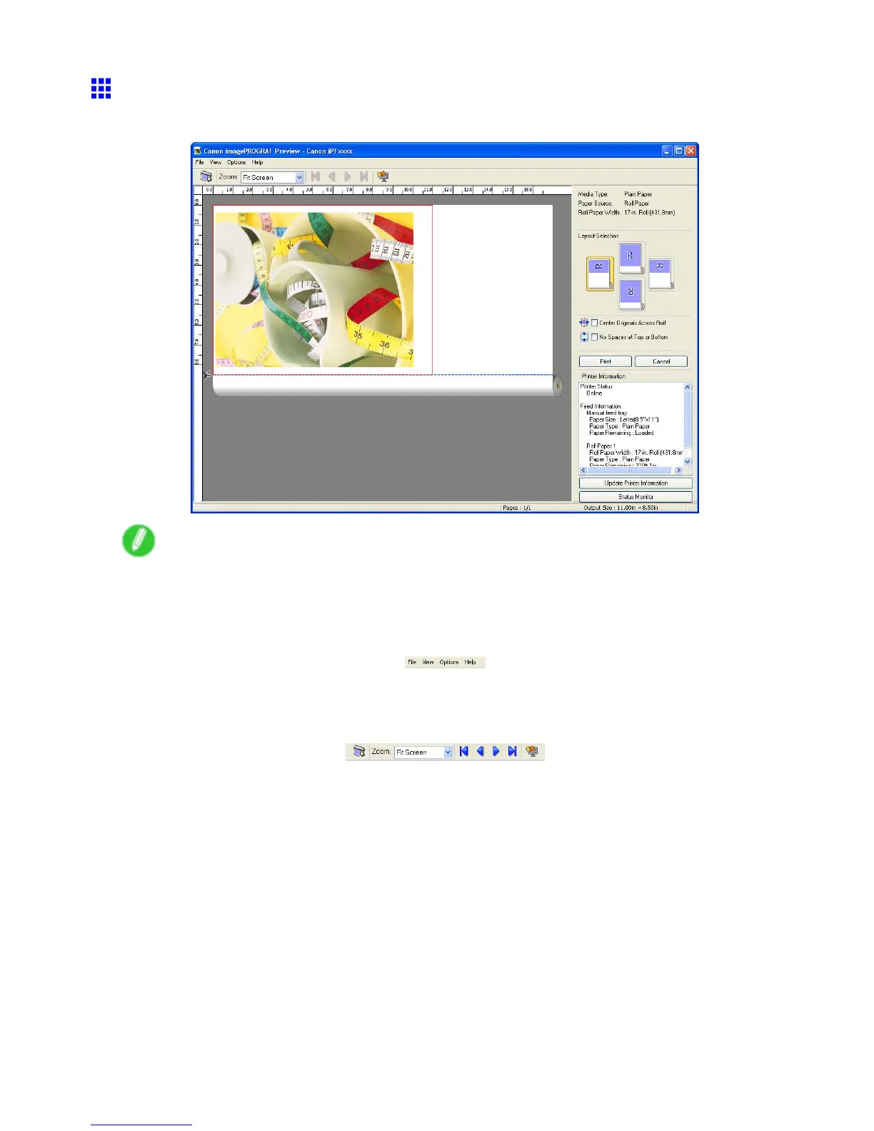Canon iPF650 - imagePROGRAF Color Inkjet Printer - Preview Main Window; Menu Bar; Tool Bar
