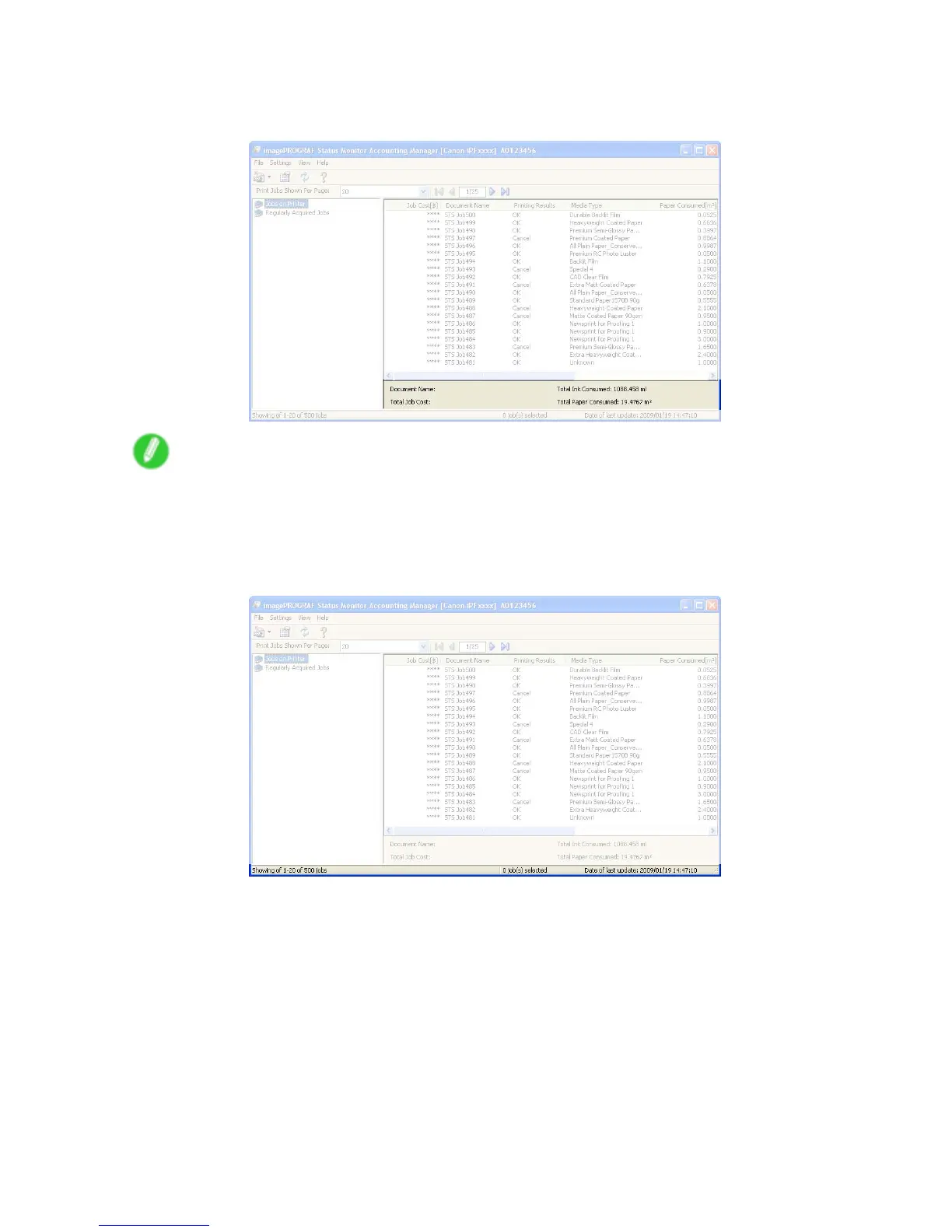 Displays the total costs for the selected job and the amounts of paper and ink consumed.