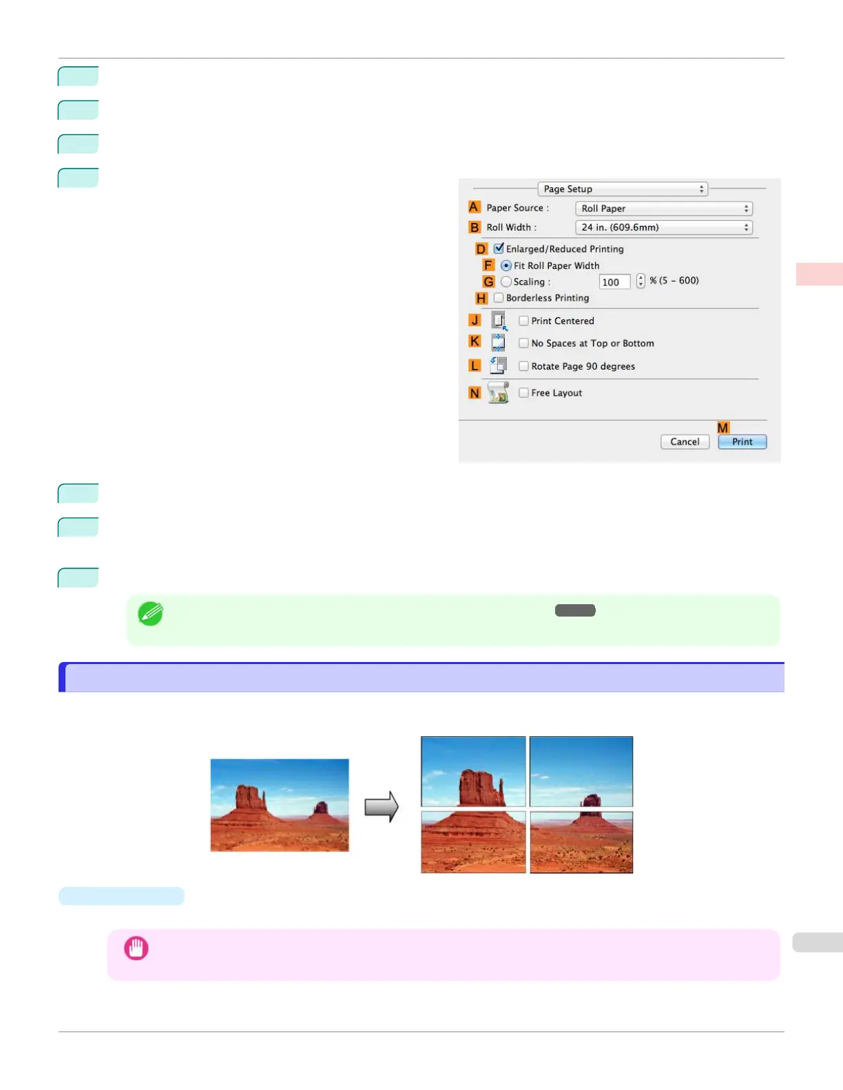 You can enlarge an original to print it in sections on several sheets. By assembling the printed sheets, you can create a