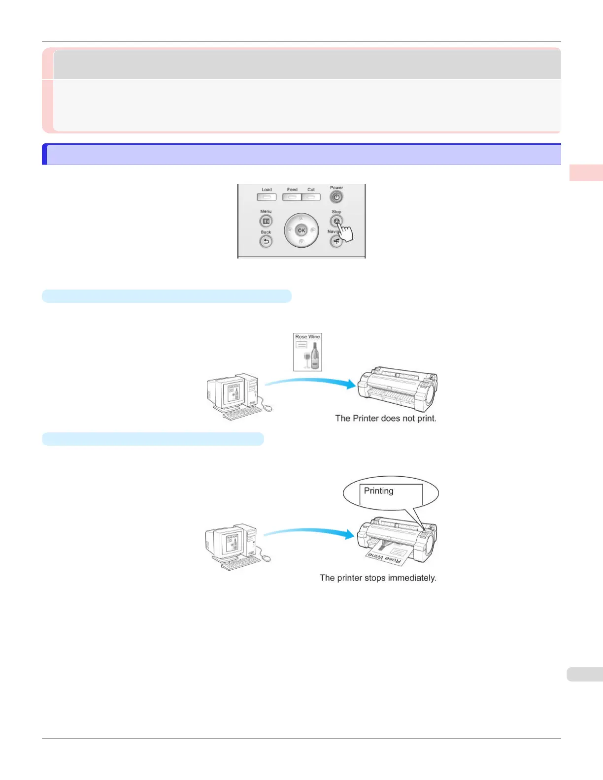 When you press the Stop button during printing, printer operation varies depending on the current status.