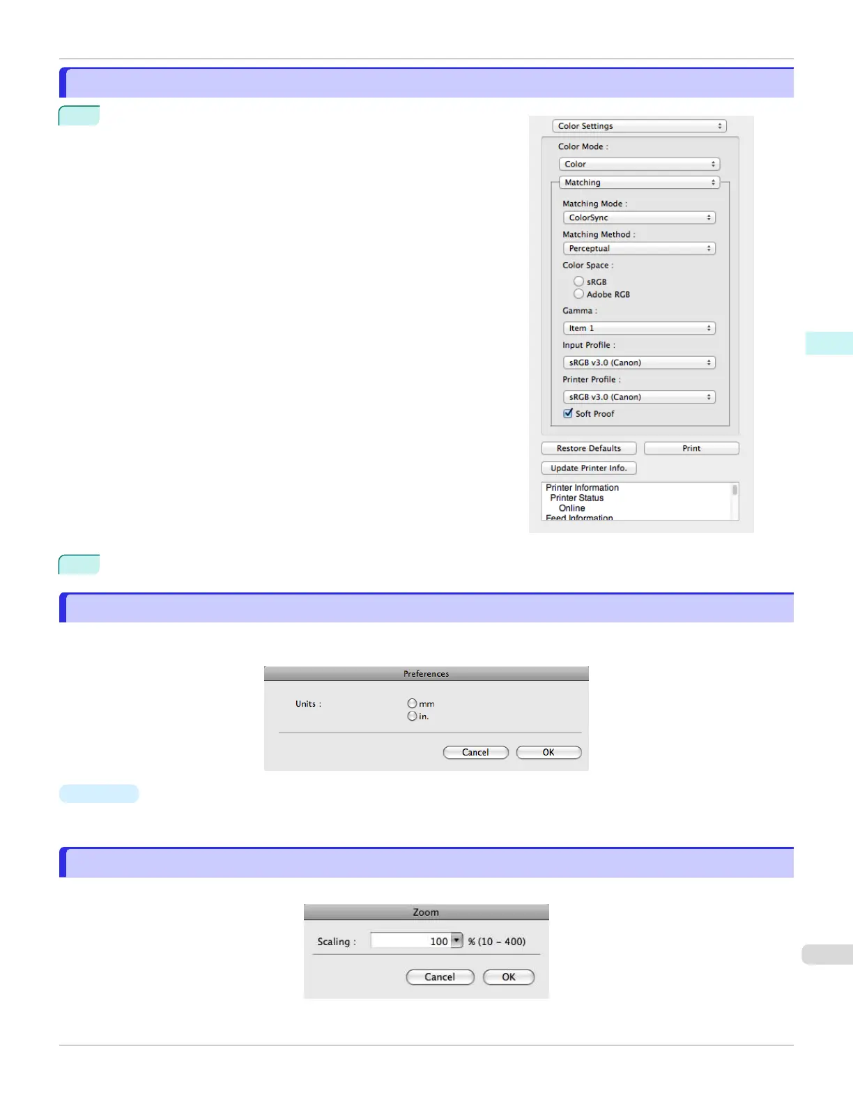 This dialog box appears when you select Preferences from the imagePROGRAF Advanced Preview menu. You can