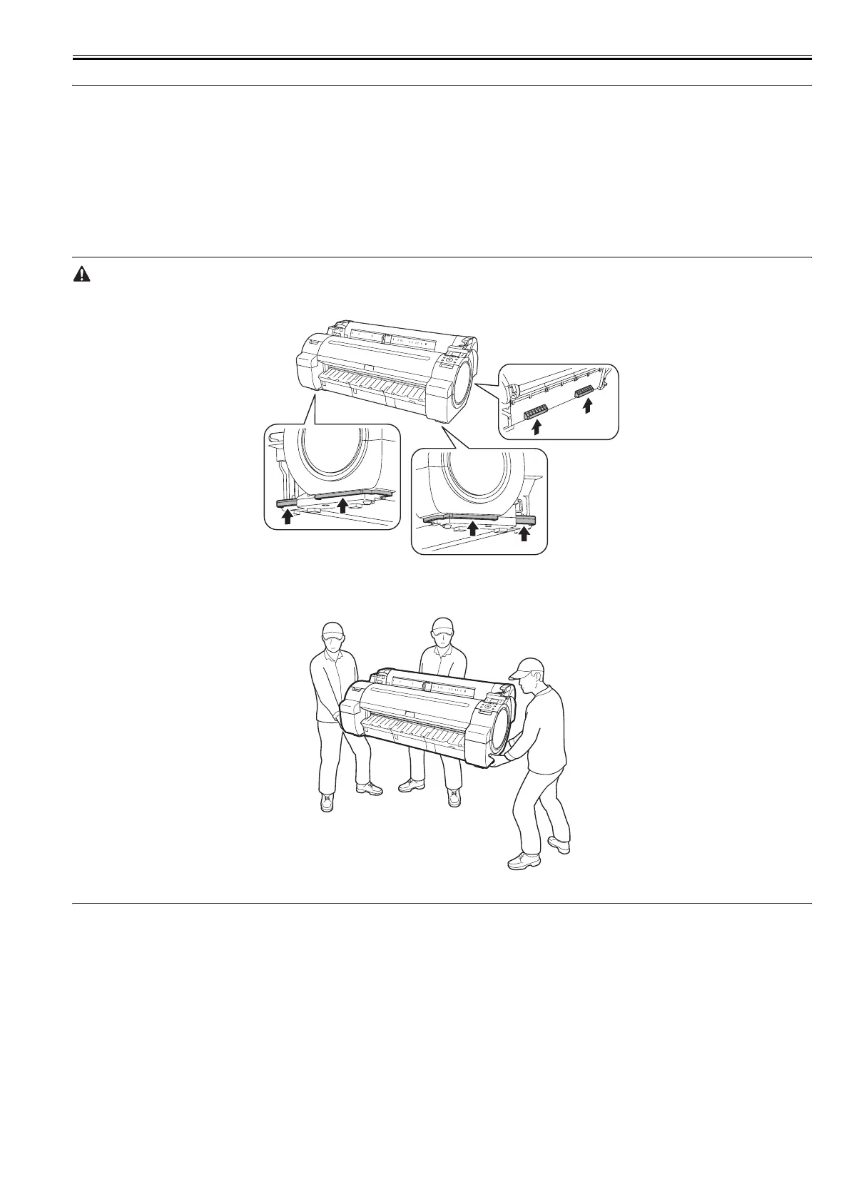 - The printer main unit weights approximately 43kg. When moving the printer, have at least three people hold it from left and right and rear side taking care not to