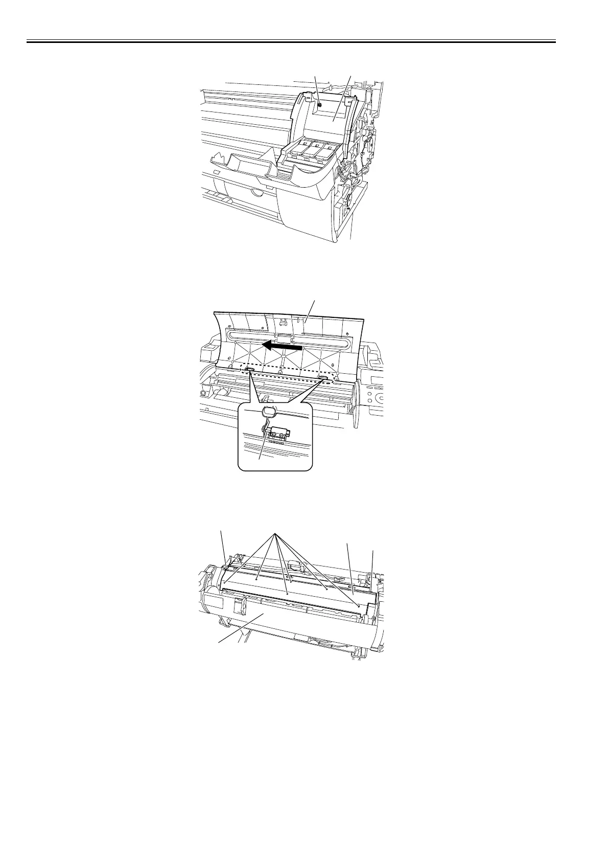 1) To remove the rear upper cover [3], remove the left/right cover and upper cover, open the roll cover [1], and then remove eight screws [2].
