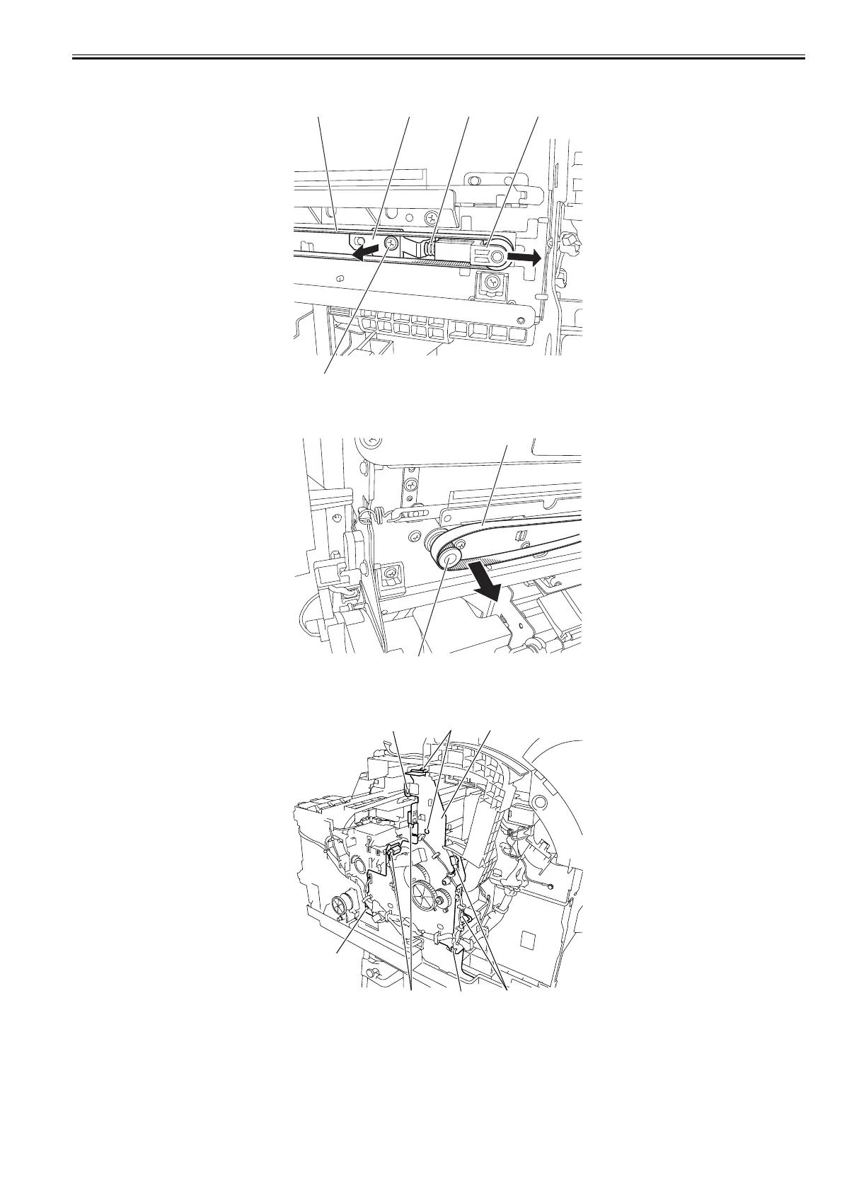 16) Remove one screw [1], the pulley retainer [2], and spring [3] to loosen the carriage belt [4]. Remove the belt [4] from the pulley unit [5], and then remove the