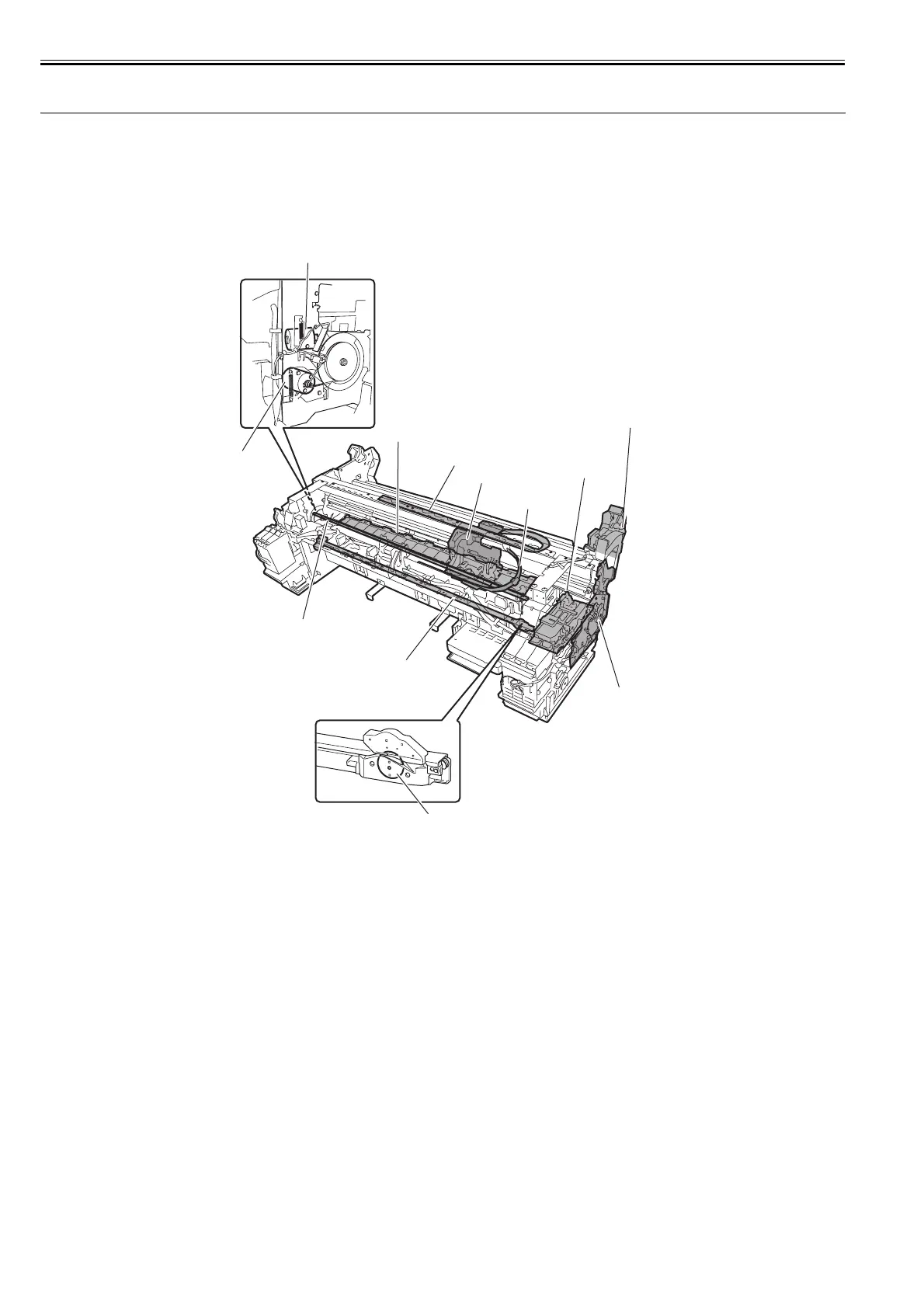 Moving parts of the printer include the carriage unit driven by the carriage motor, the carriage belt, the ink tube, the flexible cable, the feed roller driven by the feed