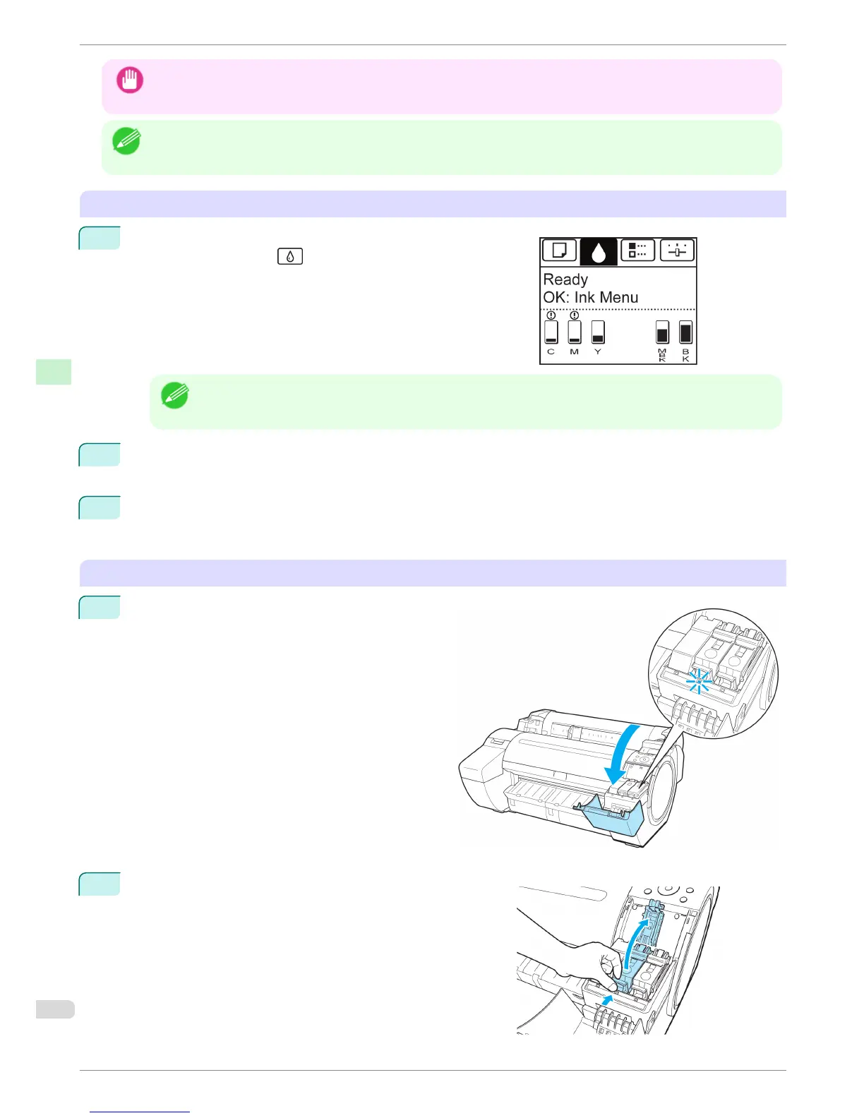 • Ink Tank replacement is possible even during printing, when print jobs are being canceled, or when paper is being