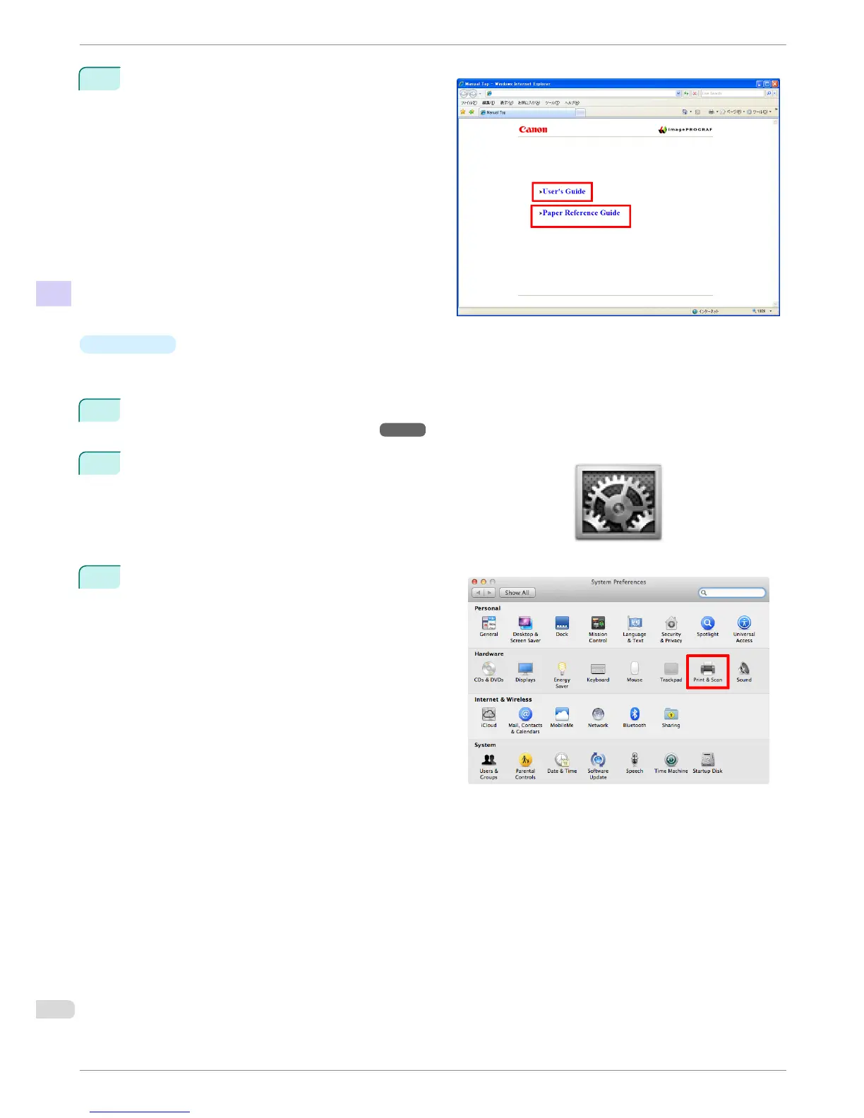 The basic instructions for displaying the User's Guide or Paper Reference Guide from imagePROGRAF Print-
