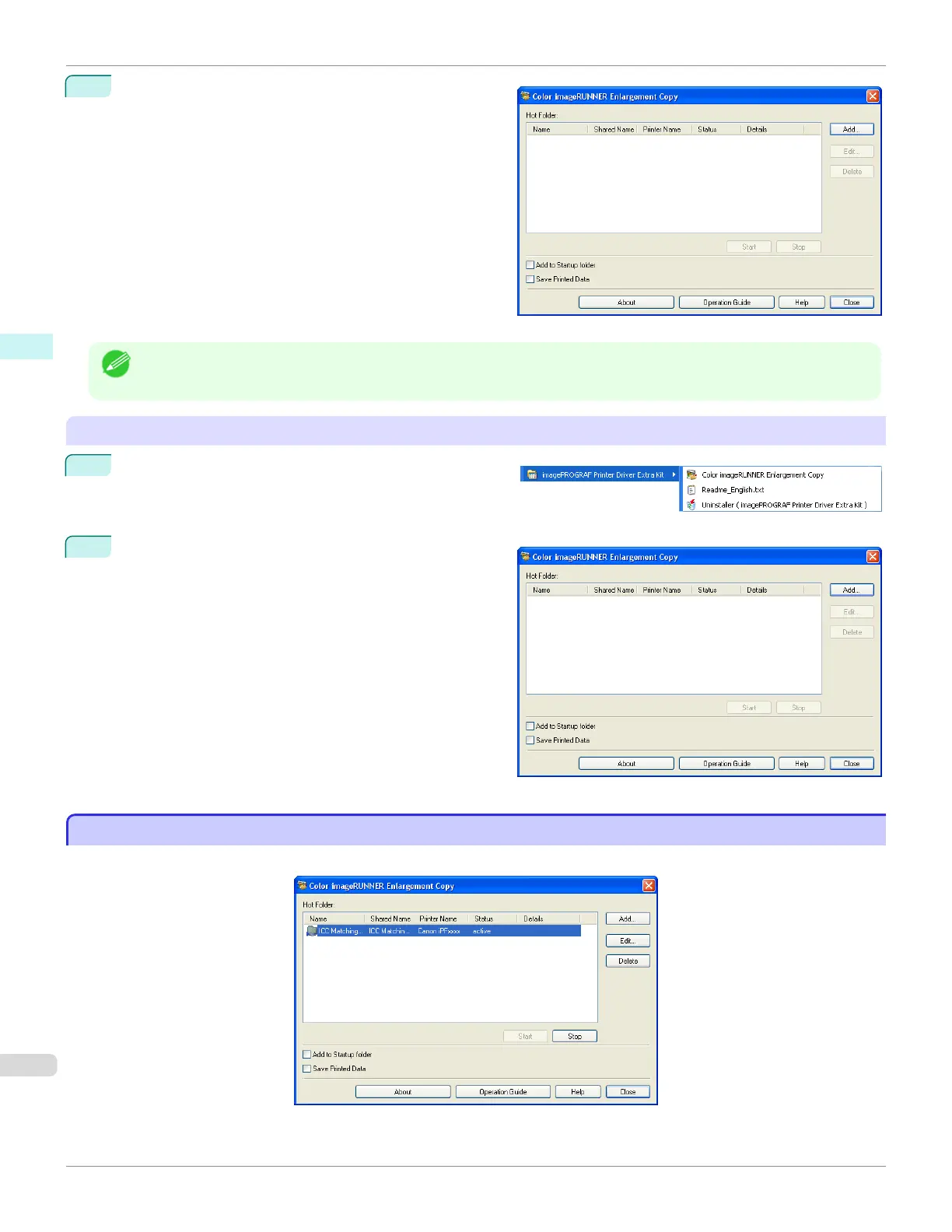 • If you click on the Add to Startup folder check box in the Color imageRUNNER Enlargement Copy dialog box, the