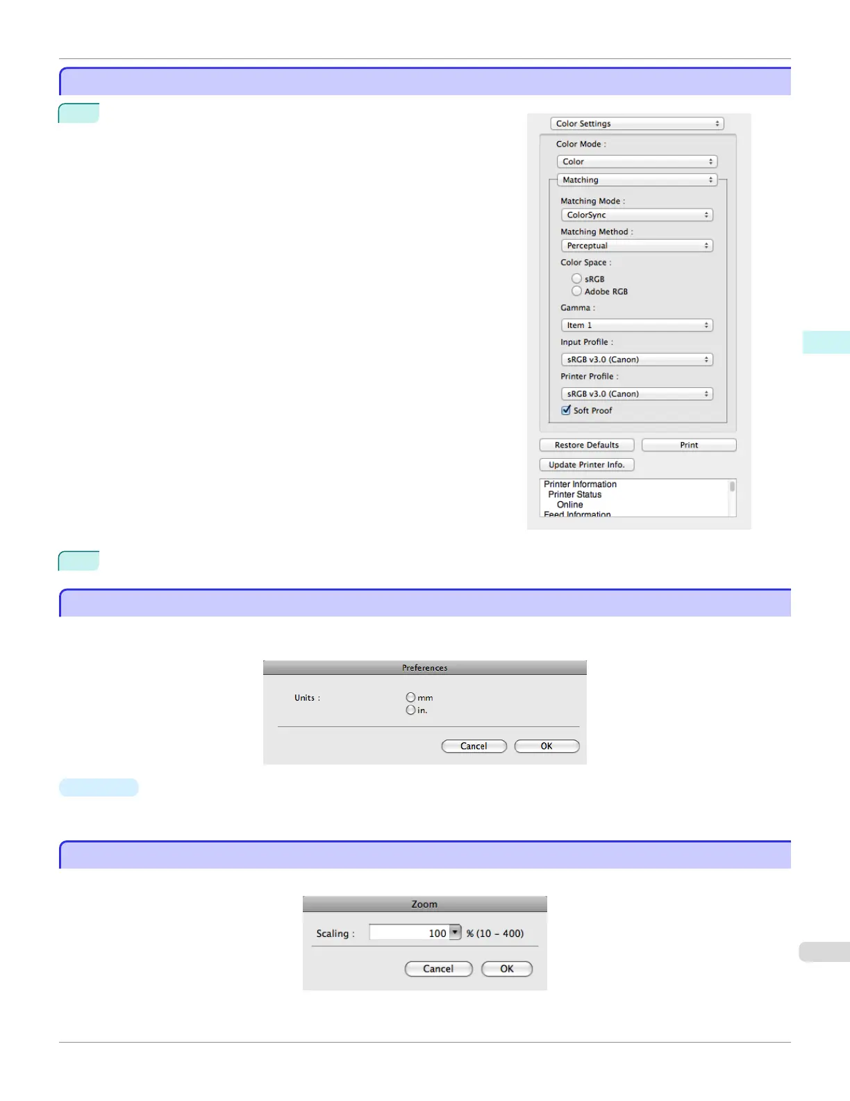 This dialog box appears when you select Preferences from the imagePROGRAF Advanced Preview menu. You can