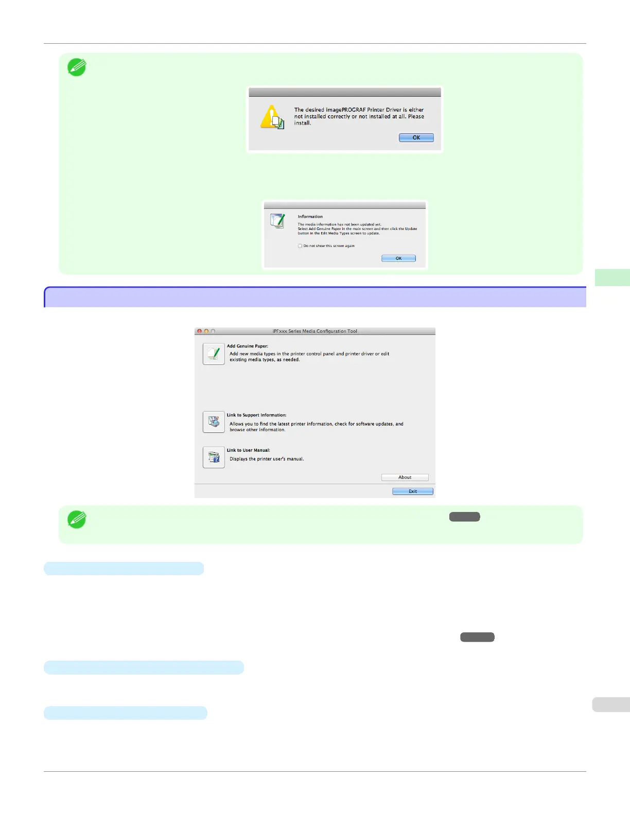 • If a compatible printer driver is not installed, the Media Configuration Tool will not start. If you attempt to start the Media