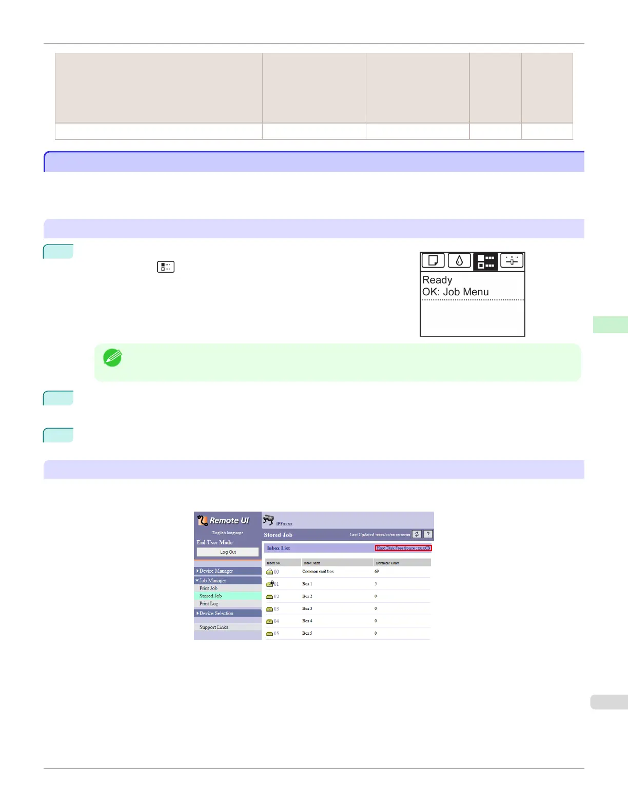 To view the box list, select Stored Job in Job Management. On the Stored Job page, the free hard disk space is