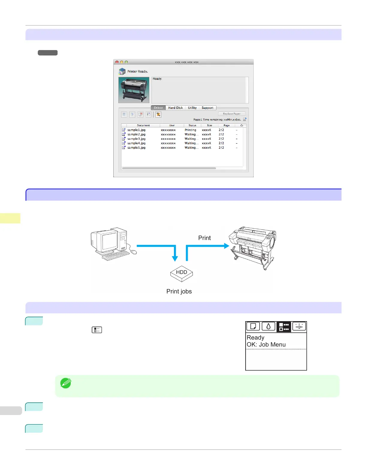Manage jobs as needed on the Driver sheet. For details, see "Job Management Using imagePROGRAF Printmoni-
