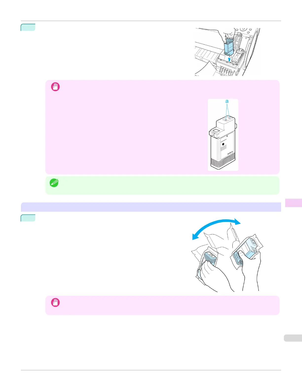 • After installing an ink tank, do not remove and shake it. Doing so may cause the ink to leak out.