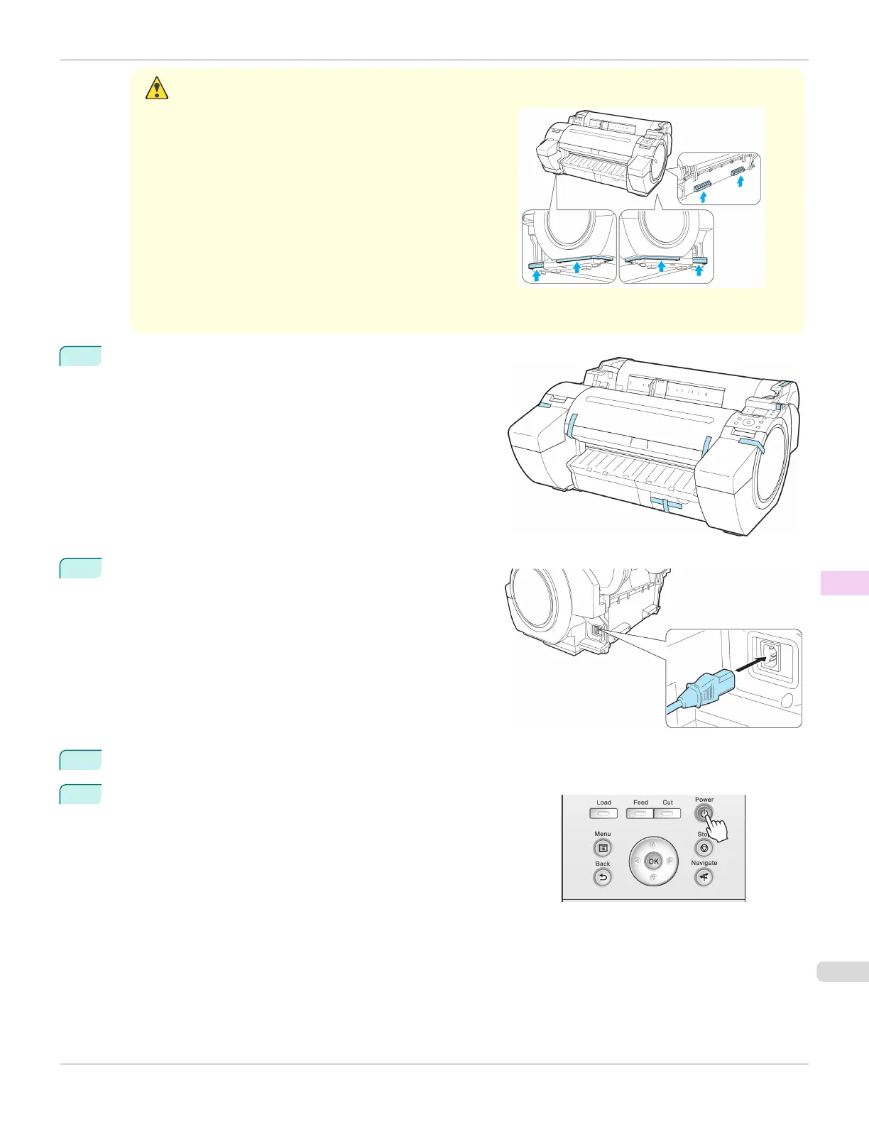 • Moving the printer requires at least three people. Be careful to avoid back strain and other injuries.