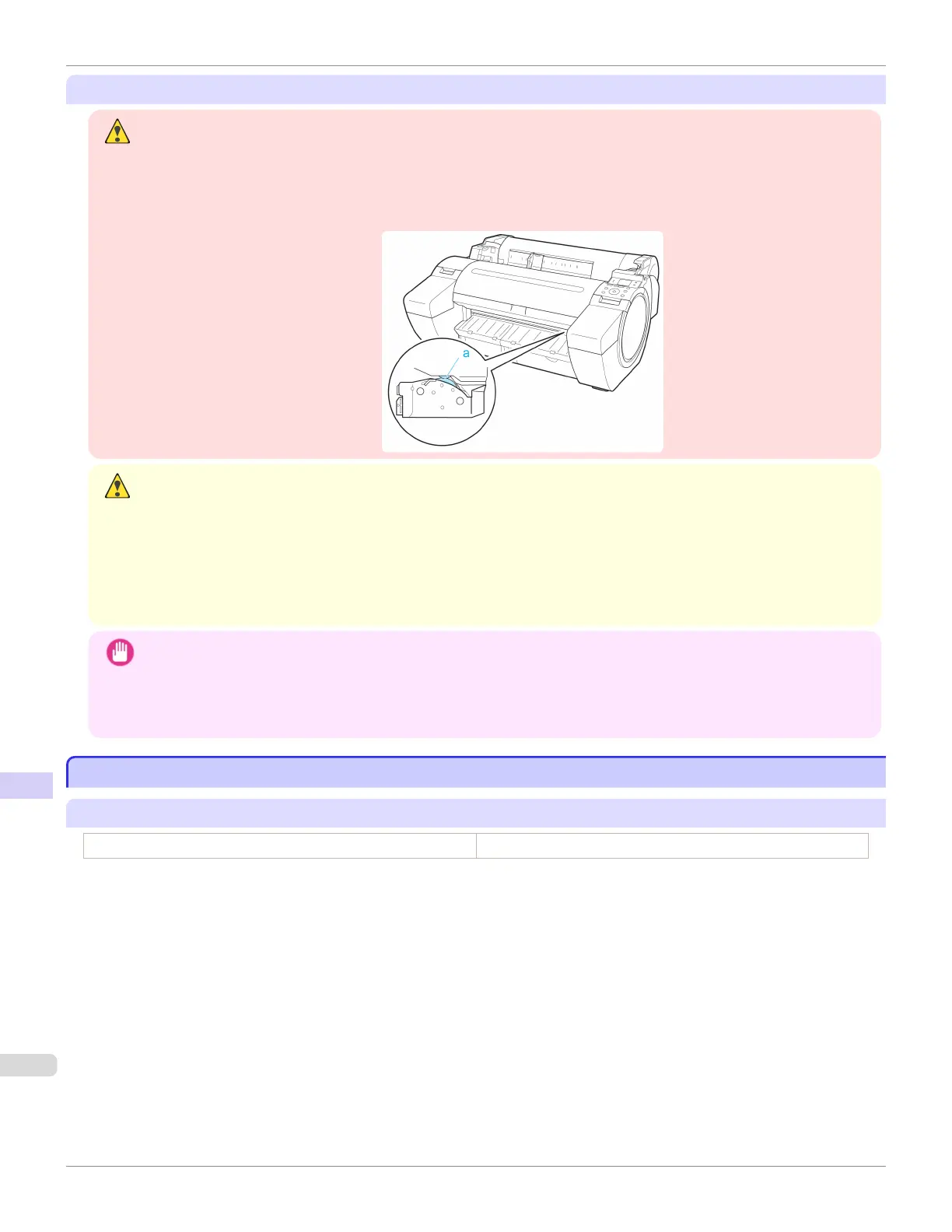 • Never insert your hand into the printer while it is printing. Moving parts inside the printer can cause injuries.