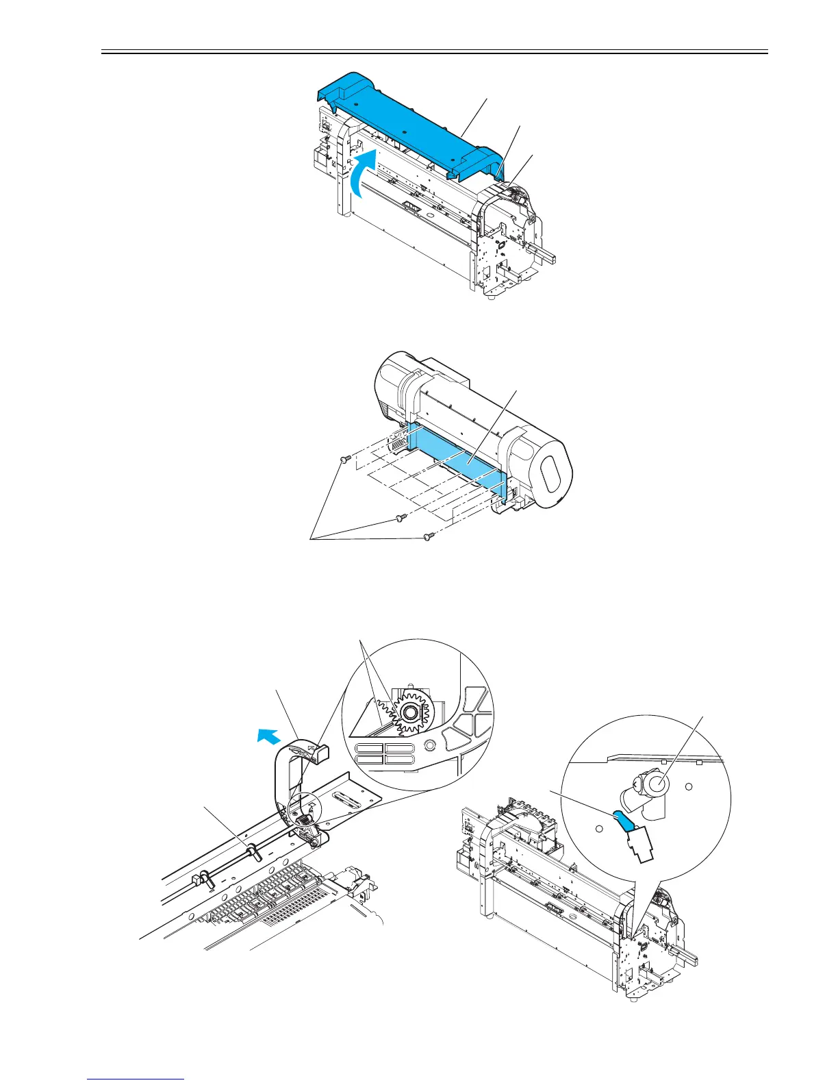 To remove paper release lever [1], do so with the pinch roller pressurized. In assembling paper release lever [1] into position, align the gear of paper release