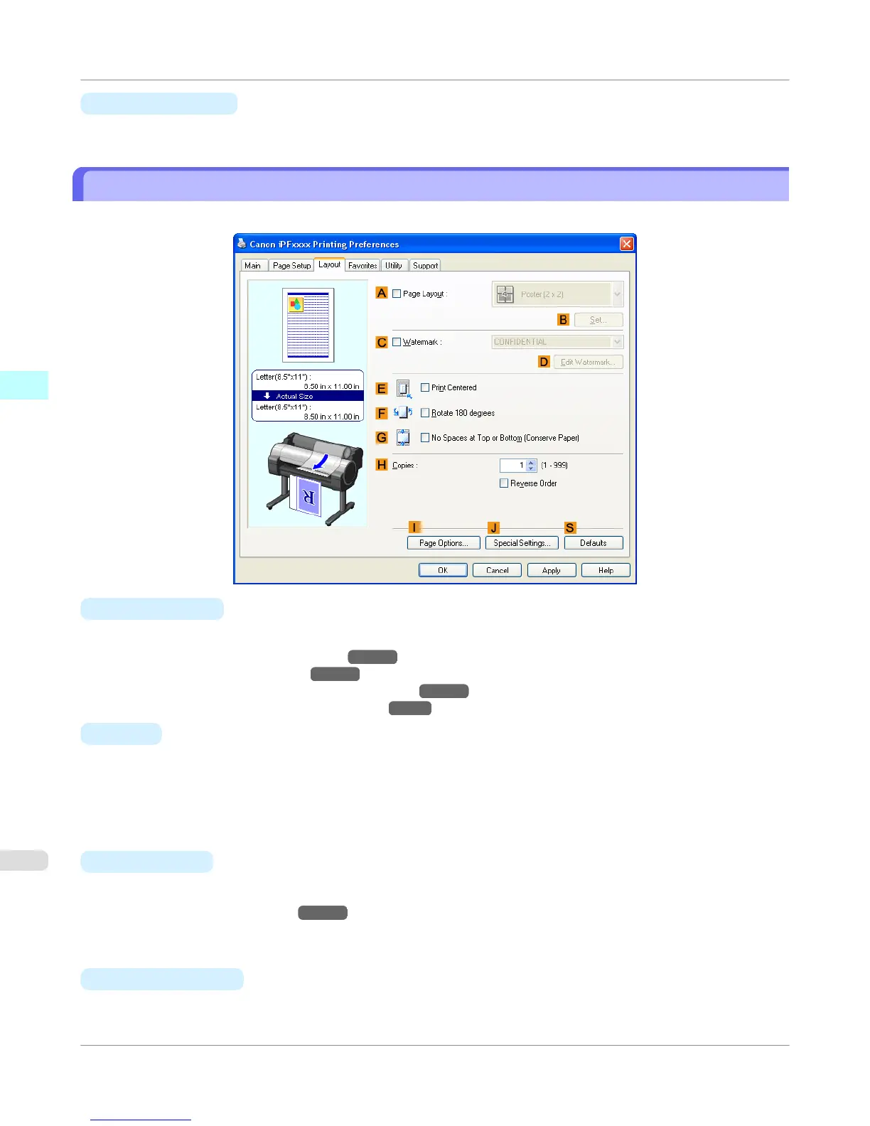 The following settings are available on the Layout sheet. For details on settings items, refer to the printer driver help.
