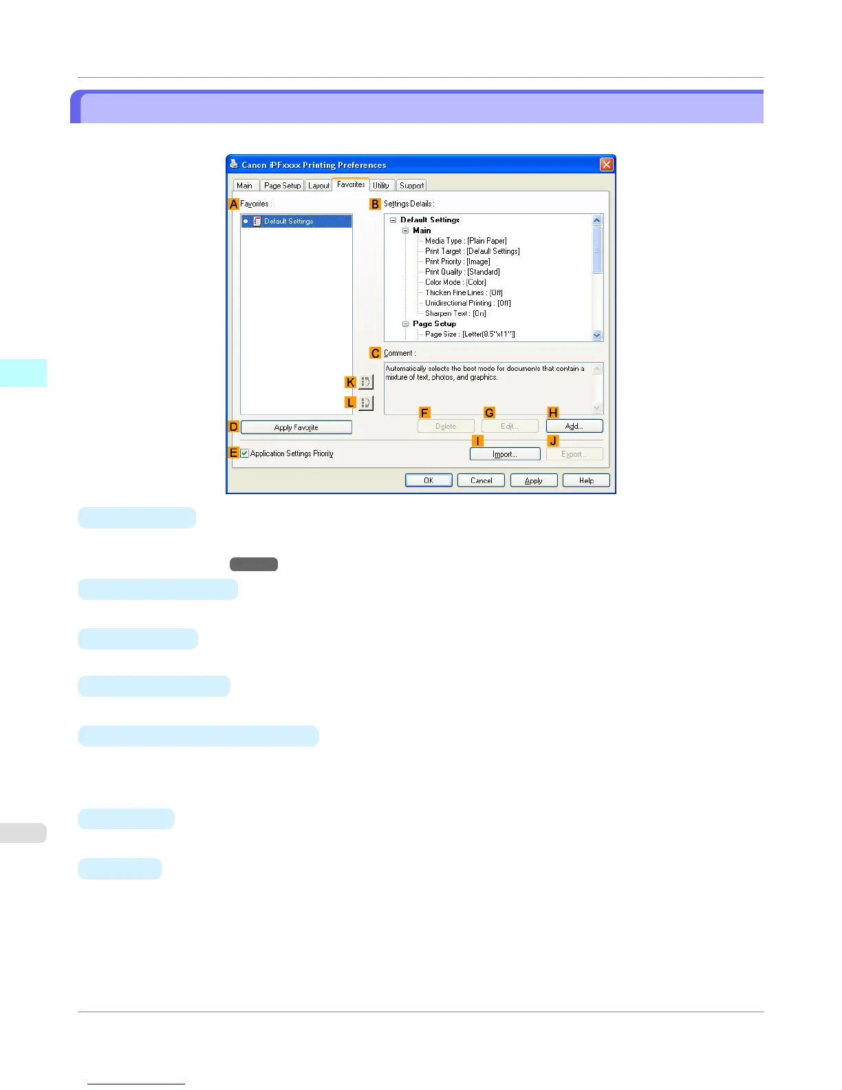 in the A Favorites, when clicking D Apply Favorite. For details on the settings items used in preference, refer to the