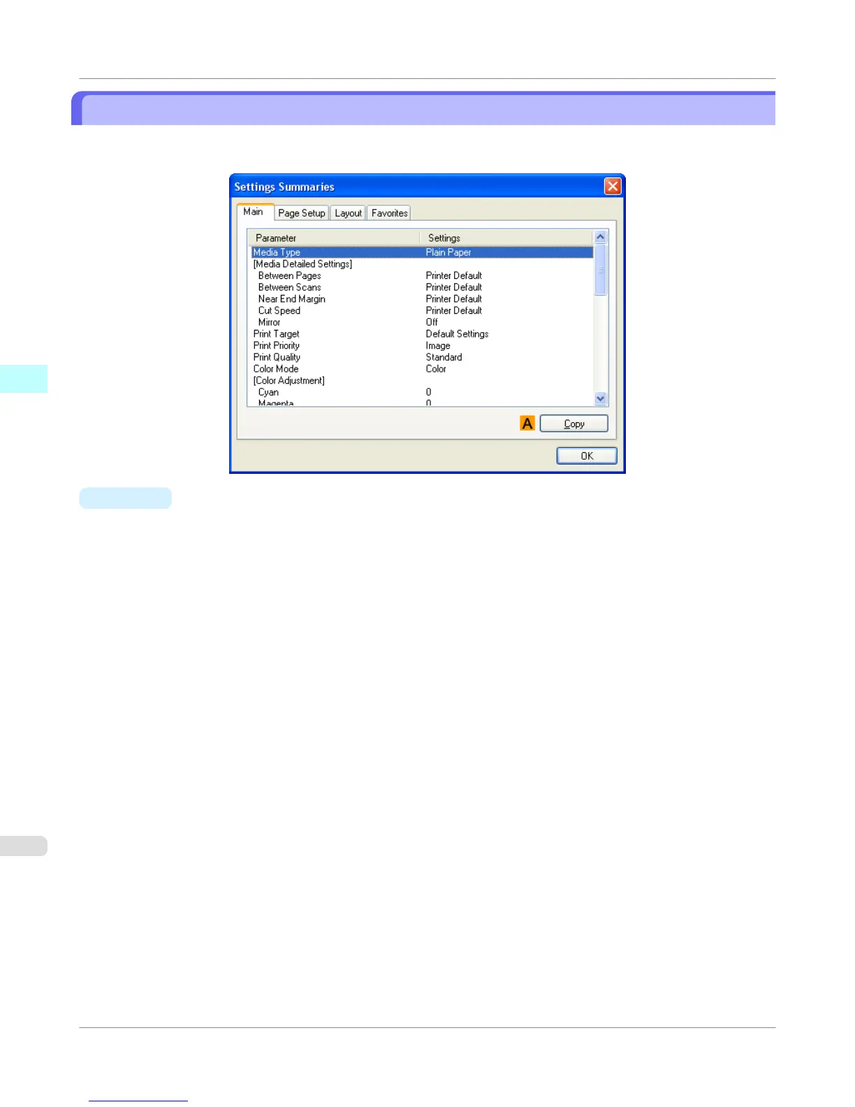 The Settings Summaries dialog box enables you to confirm the settings for the Main, Page Setup, Layout, and Favorites
