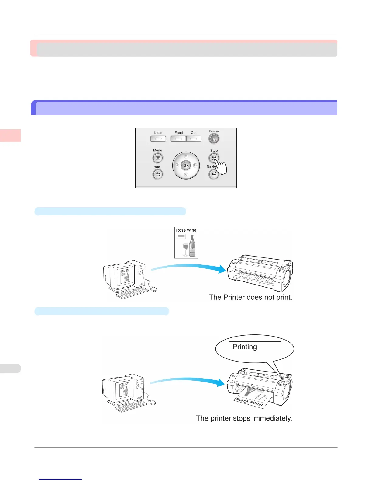 When you press the Stop button during printing, printer operation varies depending on the current status.