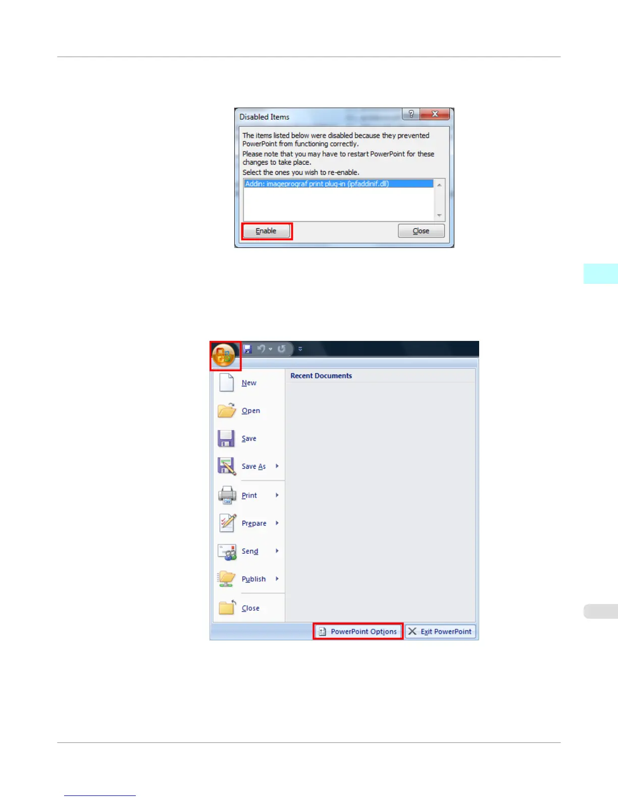 4. If Addin imageprograf print plug-in (ipfaddinif.dll) is displayed in the Disabled Items dialog box, select it and