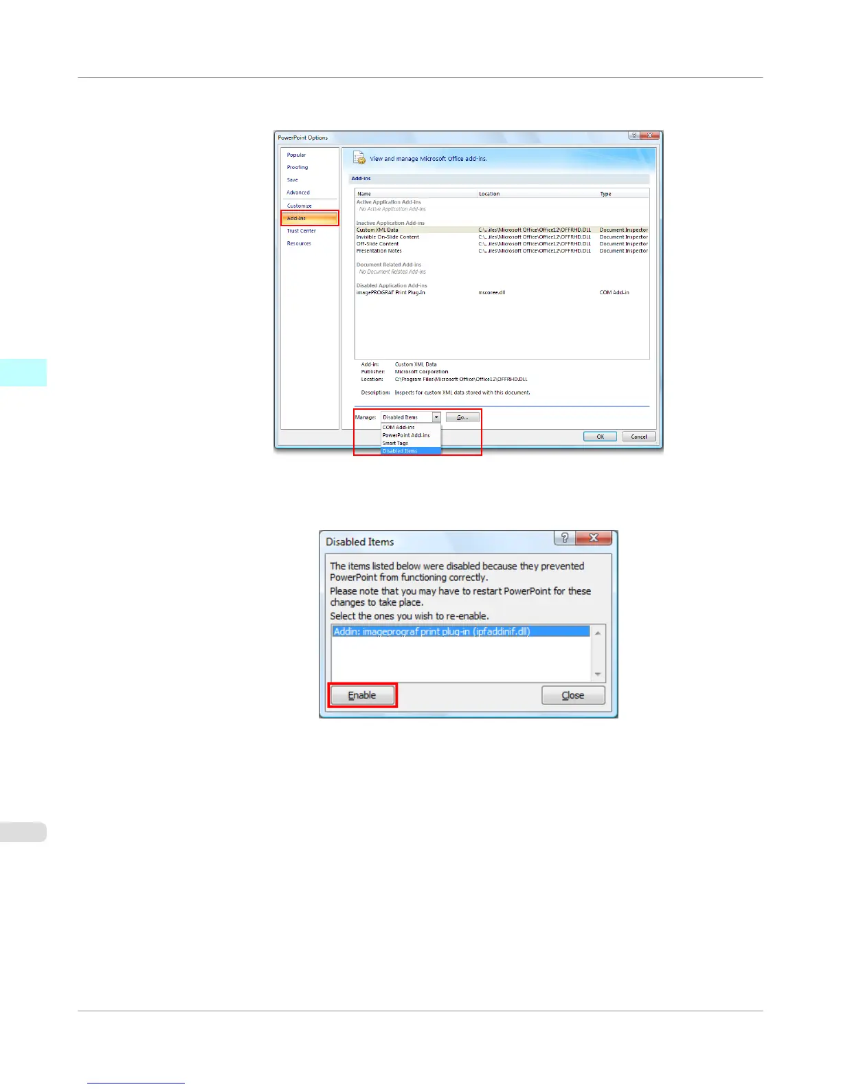 4. If Addin imageprograf print plug-in (ipfaddinif.dll) is displayed in the Disabled Items dialog box, select it and