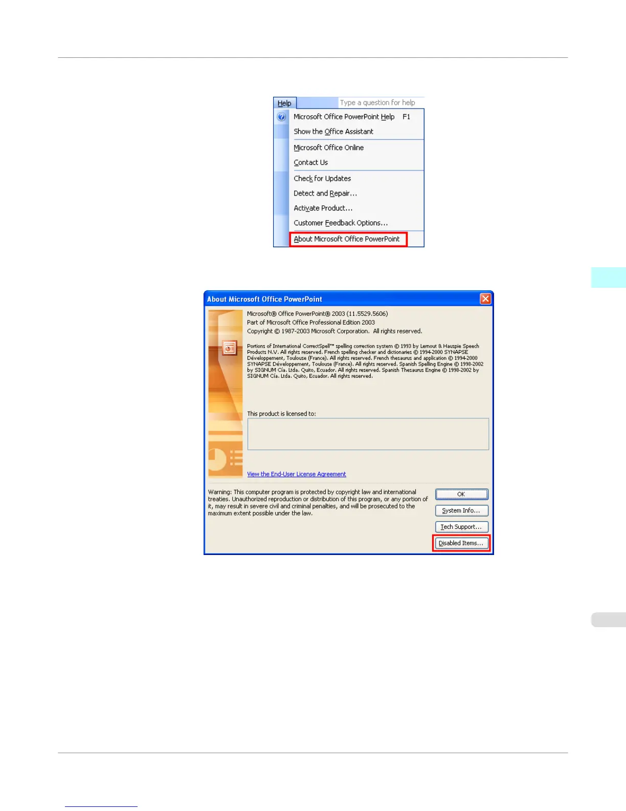 2. Click the Disabled Items button in the About <application name> dialog box.