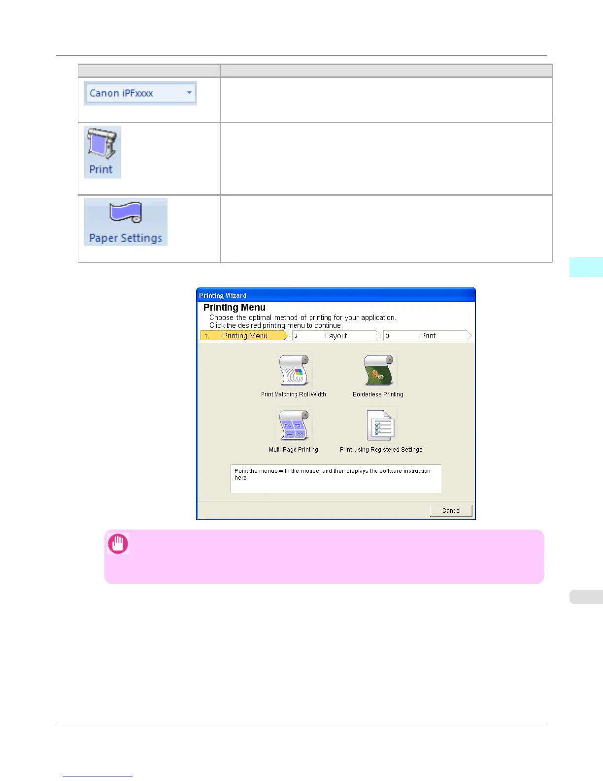• If you want to change the display to another file or application while the Printing Wizard is open,