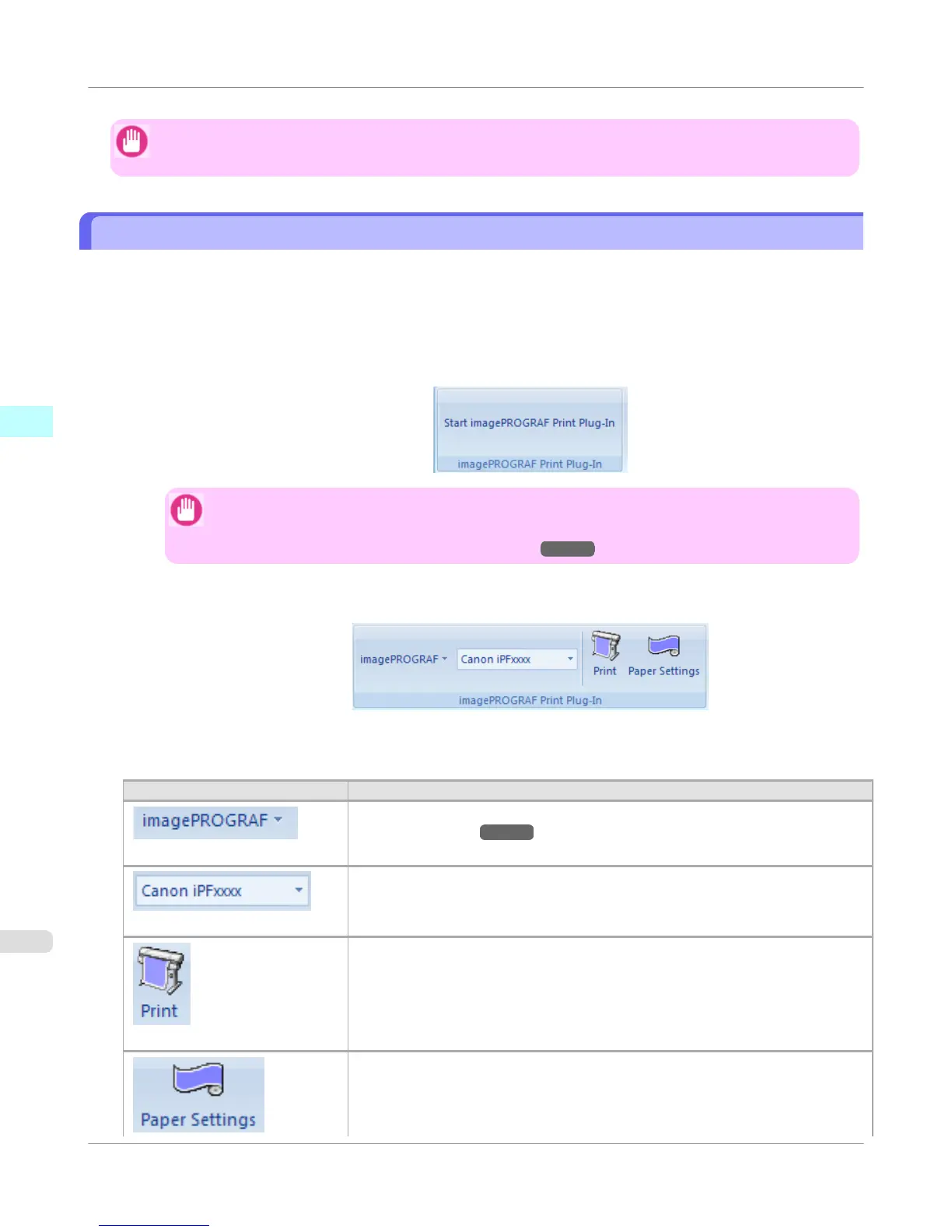 • If the imagePROGRAF Print Plug-In toolbar/ribbon is not displayed, refer to the following.