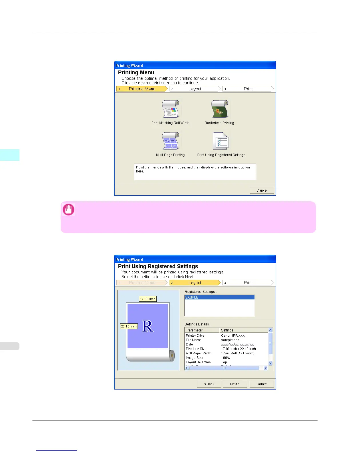 • If you want to change the display to another file or application while the Printing Wizard is open,