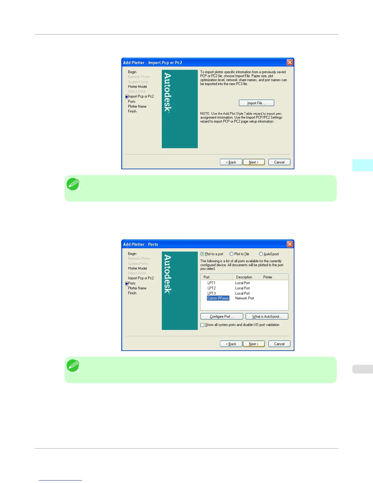 • In the Add Plotter - Ports screen, it is recommended to select Network Port. If you select Local