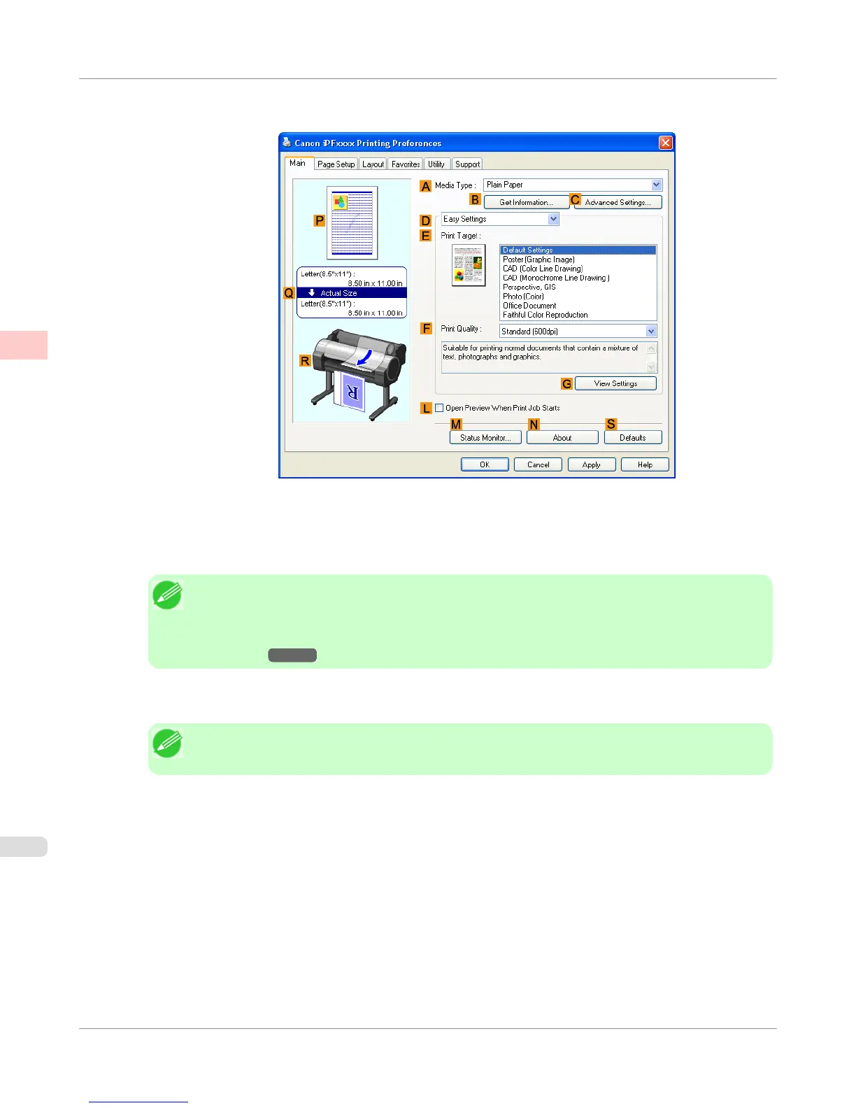 • You can check the settings values selected in the E Print Target list by clicking G View Settings.