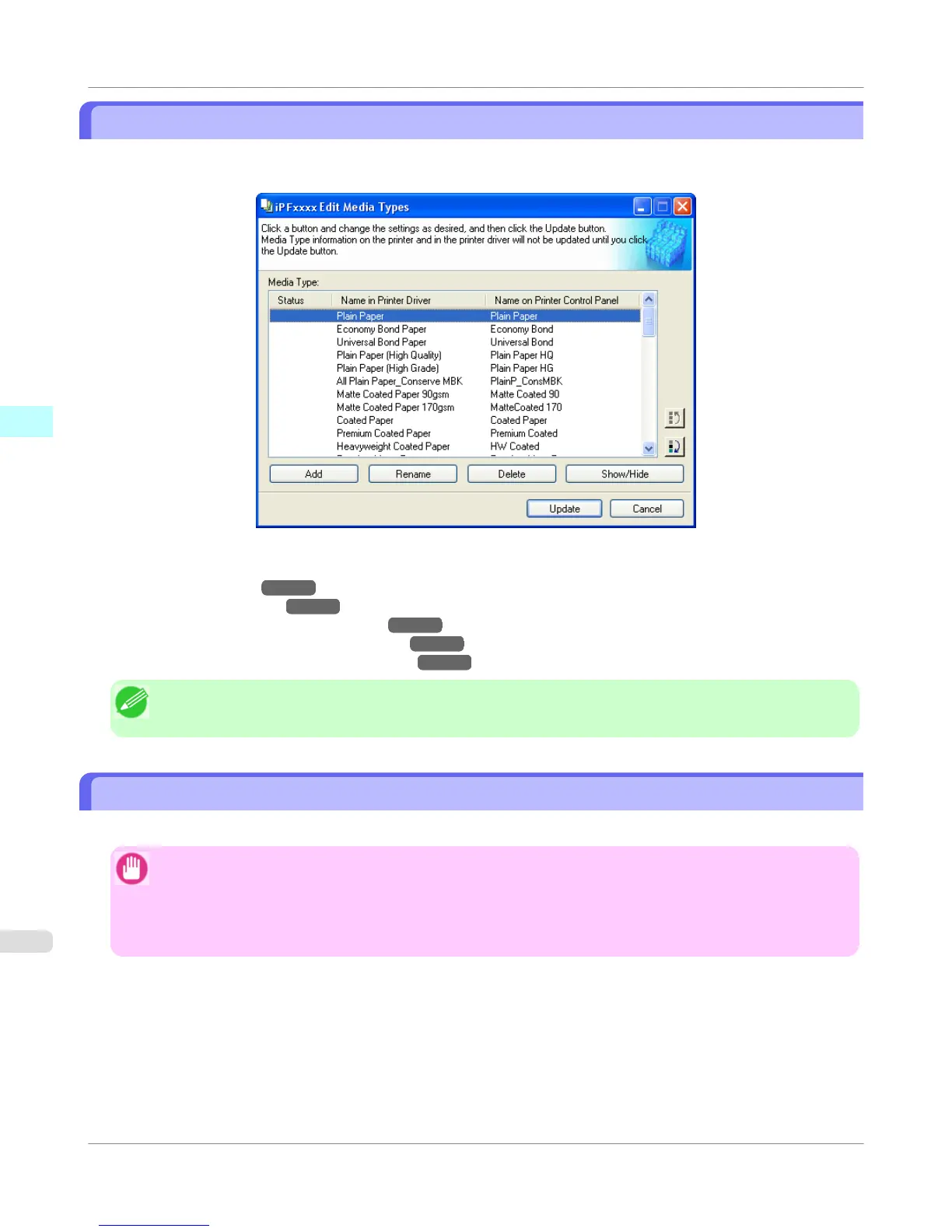 Media information files (.amf files) released by Canon are registered in the printer control panel and printer driver.