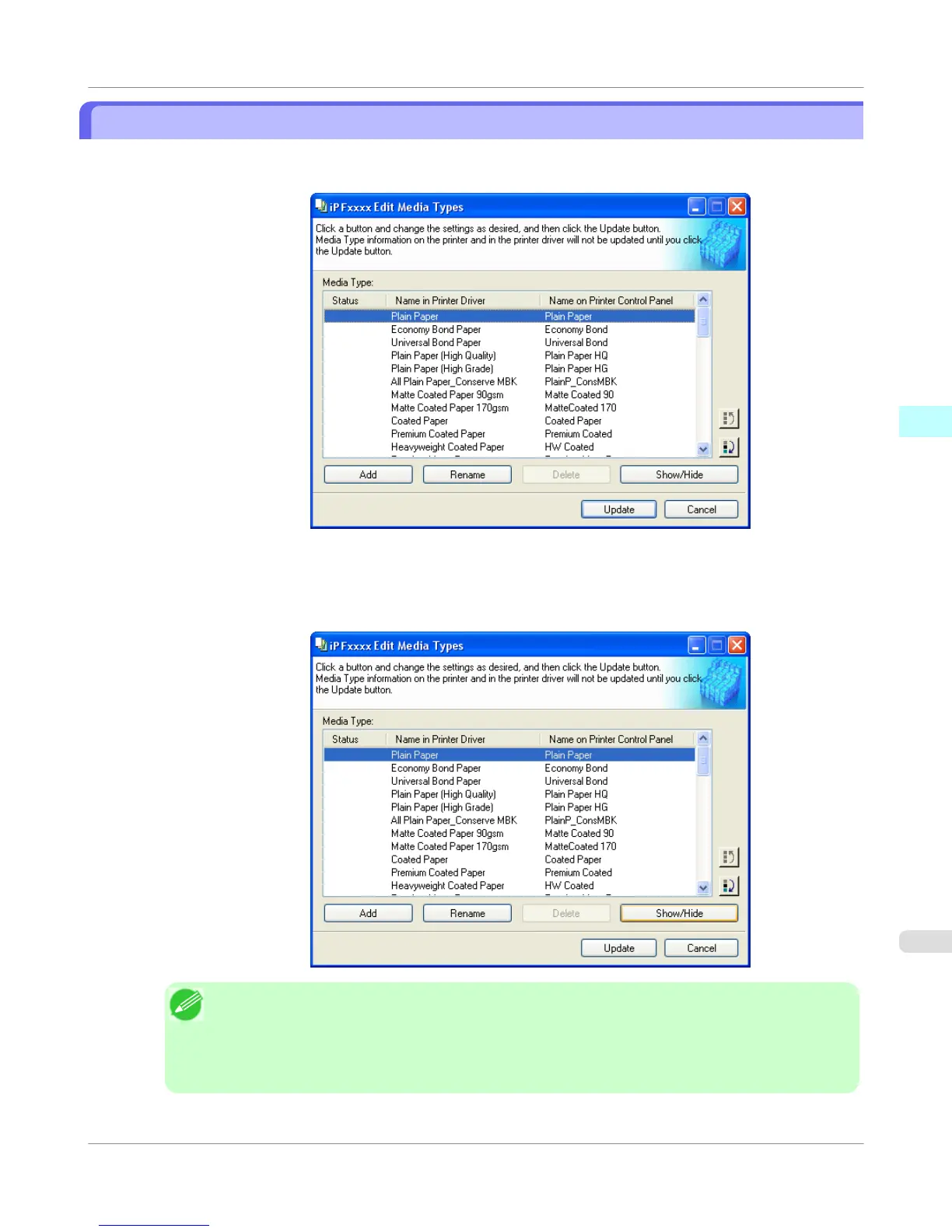 • Each time you click the Show/Hide button, the display mode cycles from showing both the printer