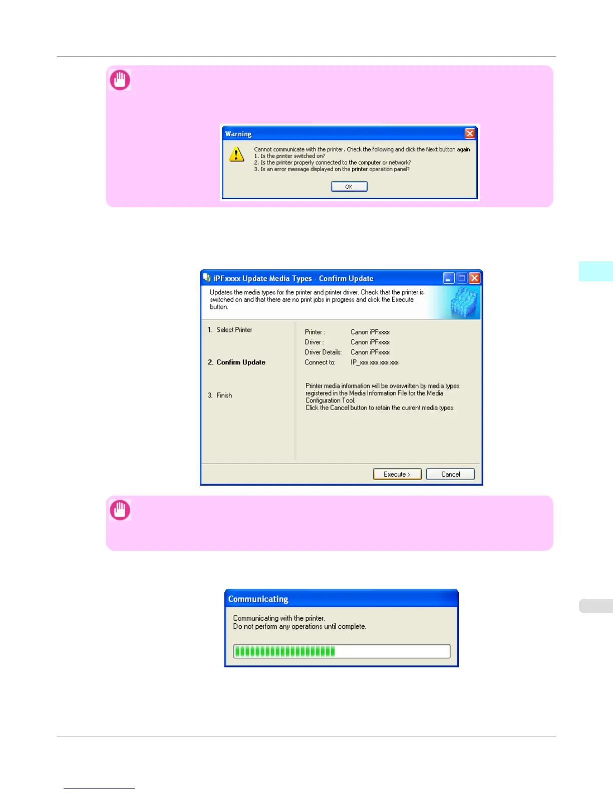 • When the program cannot communicate with the printer, the following warning message is dis-