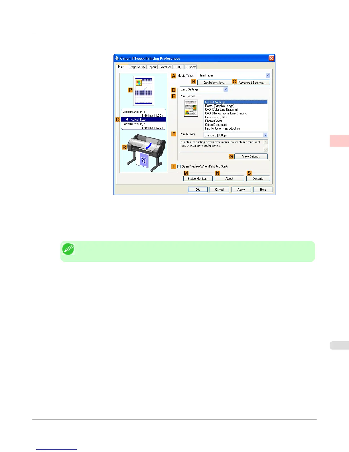 • You can check the settings values selected in the E Print Target list by clicking G View Settings.