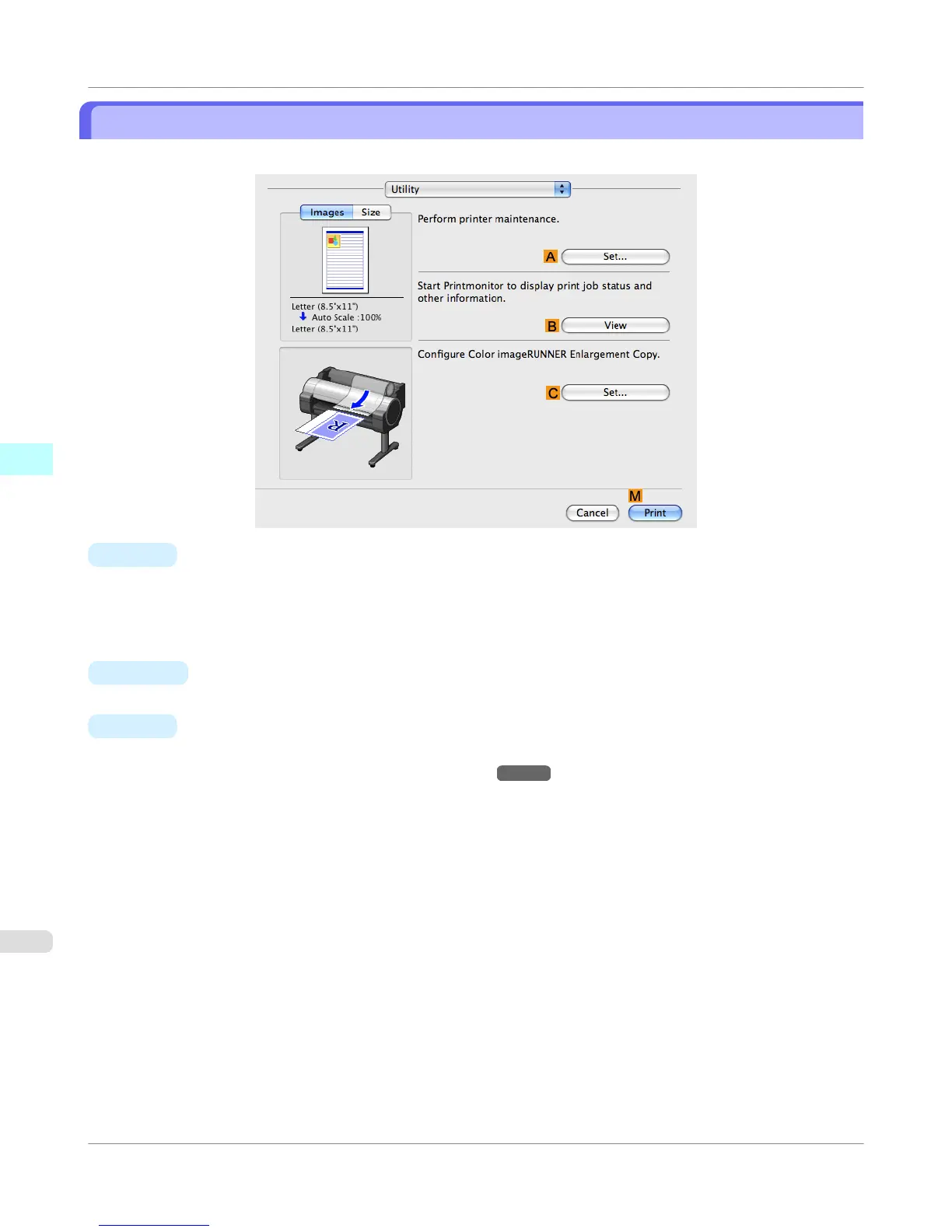 Click to start imagePROGRAF Printmonitor, which enables you to view the status of print jobs.
