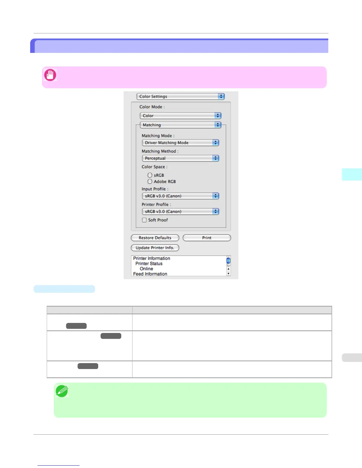 • Using Mac OS X 10.5 or later, ColorSync needs to be selected in the Color Matching panel of the