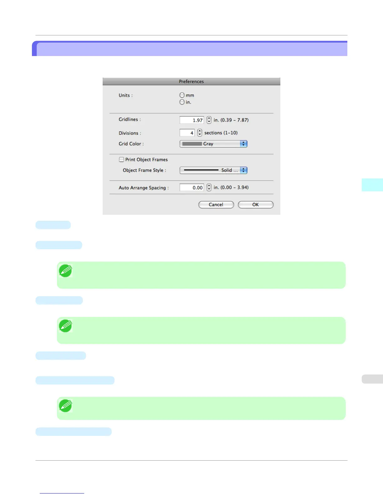 This dialog box appears when you select Preferences from the imagePROGRAF Advanced Preview menu. You can set the