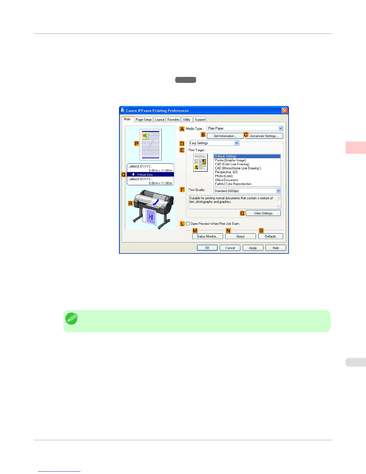 • You can check the settings values selected in the E Print Target list by clicking G View Settings.