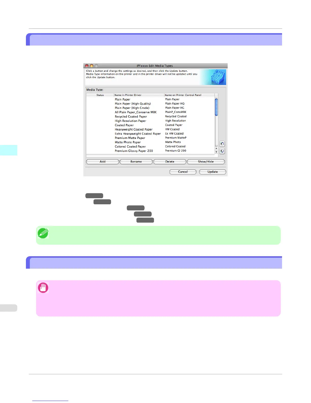 • Do not perform printing on the target printer while adding the media types.