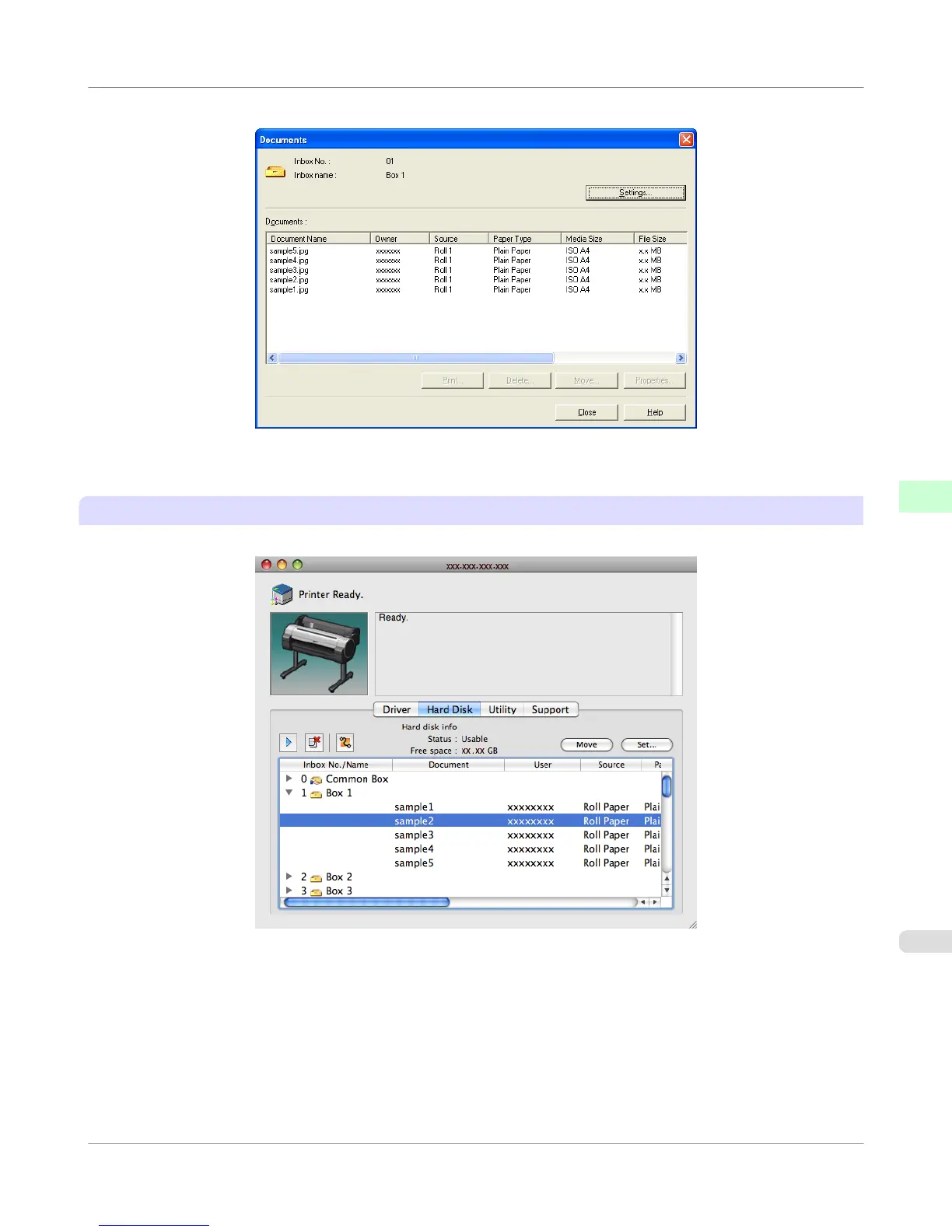 Jobs saved in that box are displayed in the Documents dialog box.