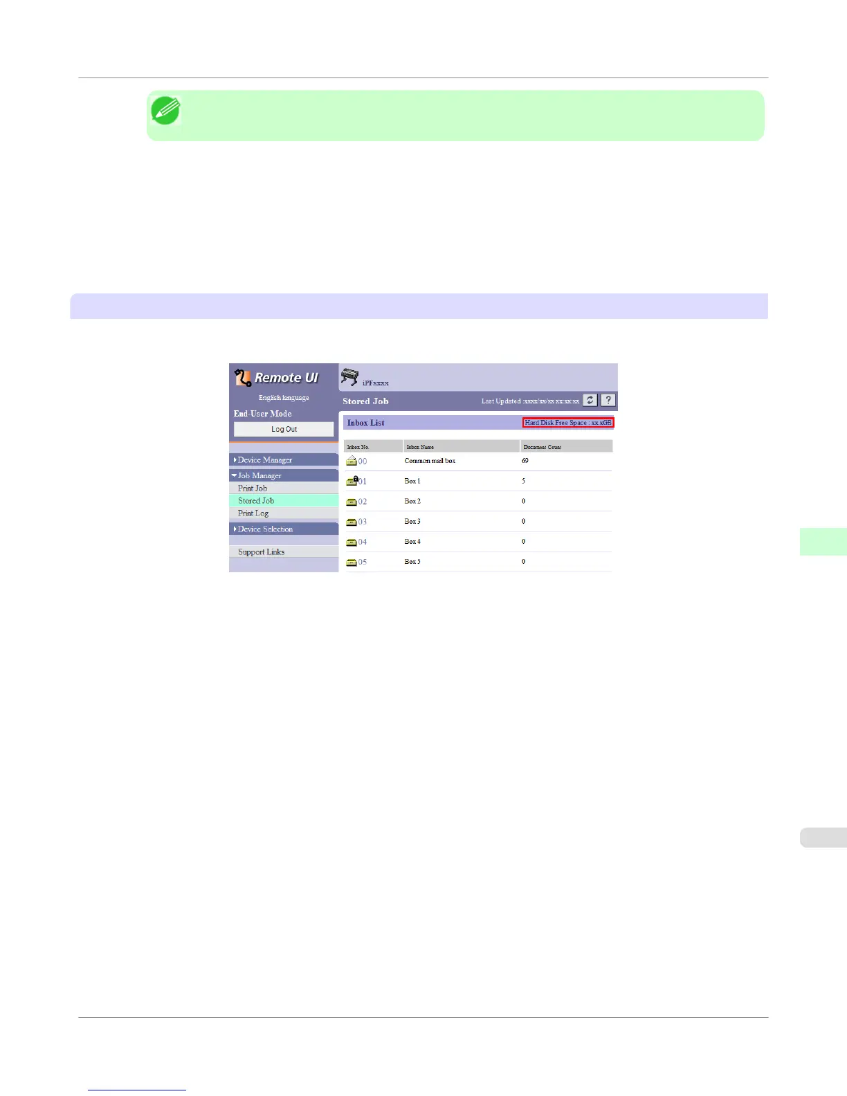 To view the box list, select Stored Job in Job Management. On the Stored Job page, the free hard disk space is shown in