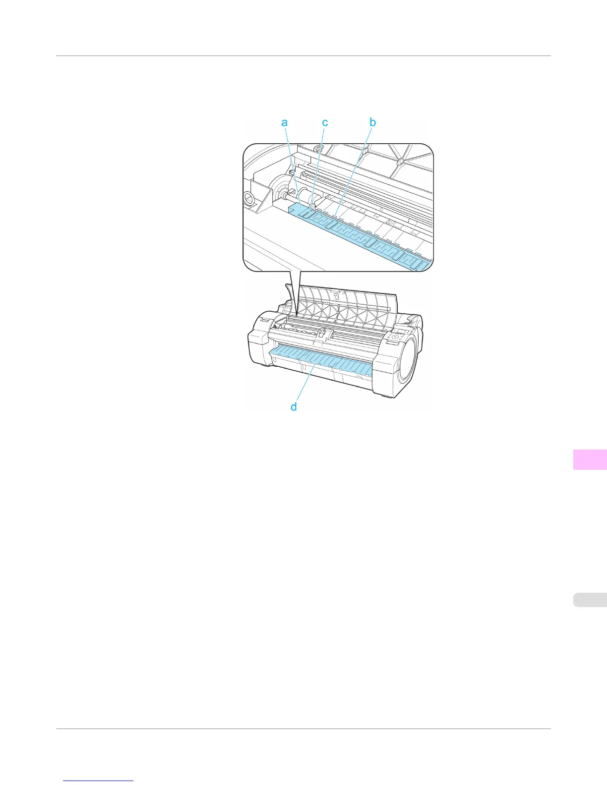 residue on the Platen as a whole (a), the Paper Retainer (b), Borderless Printing Ink Grooves (c), and Ejection