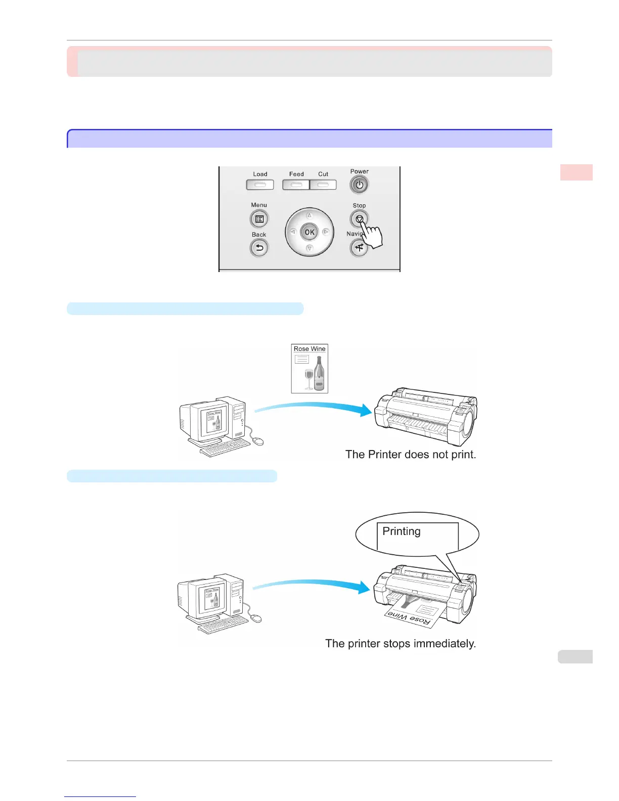 When you press the Stop button during printing, printer operation varies depending on the current status.