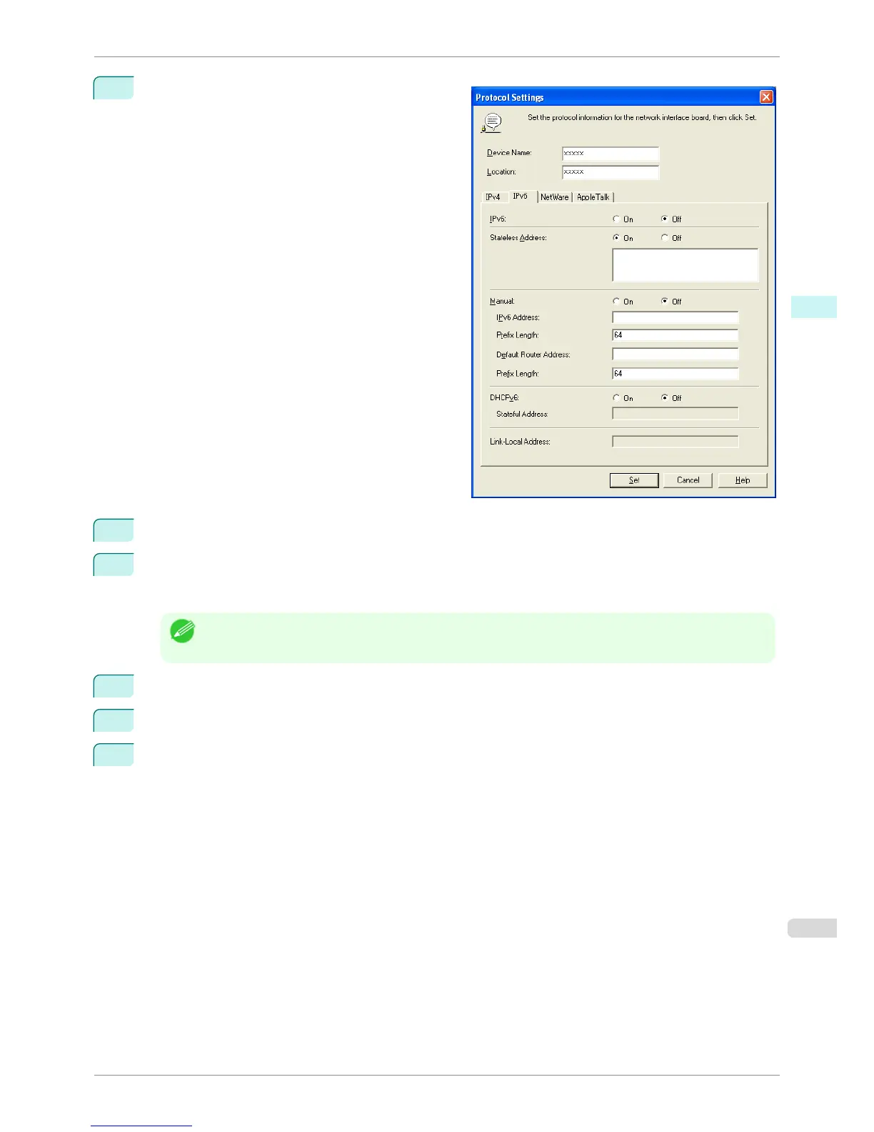 • When there is no IPv6-compatible router or DHCPv6-compatible server, select On in Manual and enter the IPv6