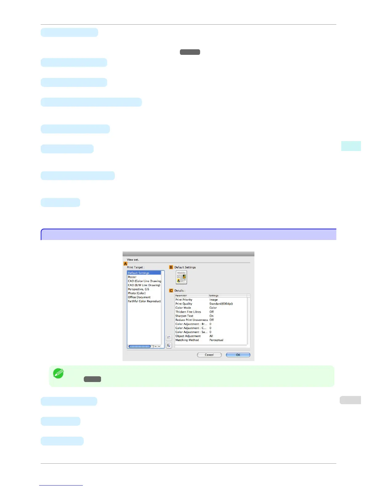 Here, you can confirm detailed settings values for each item selected in the Print Target list.